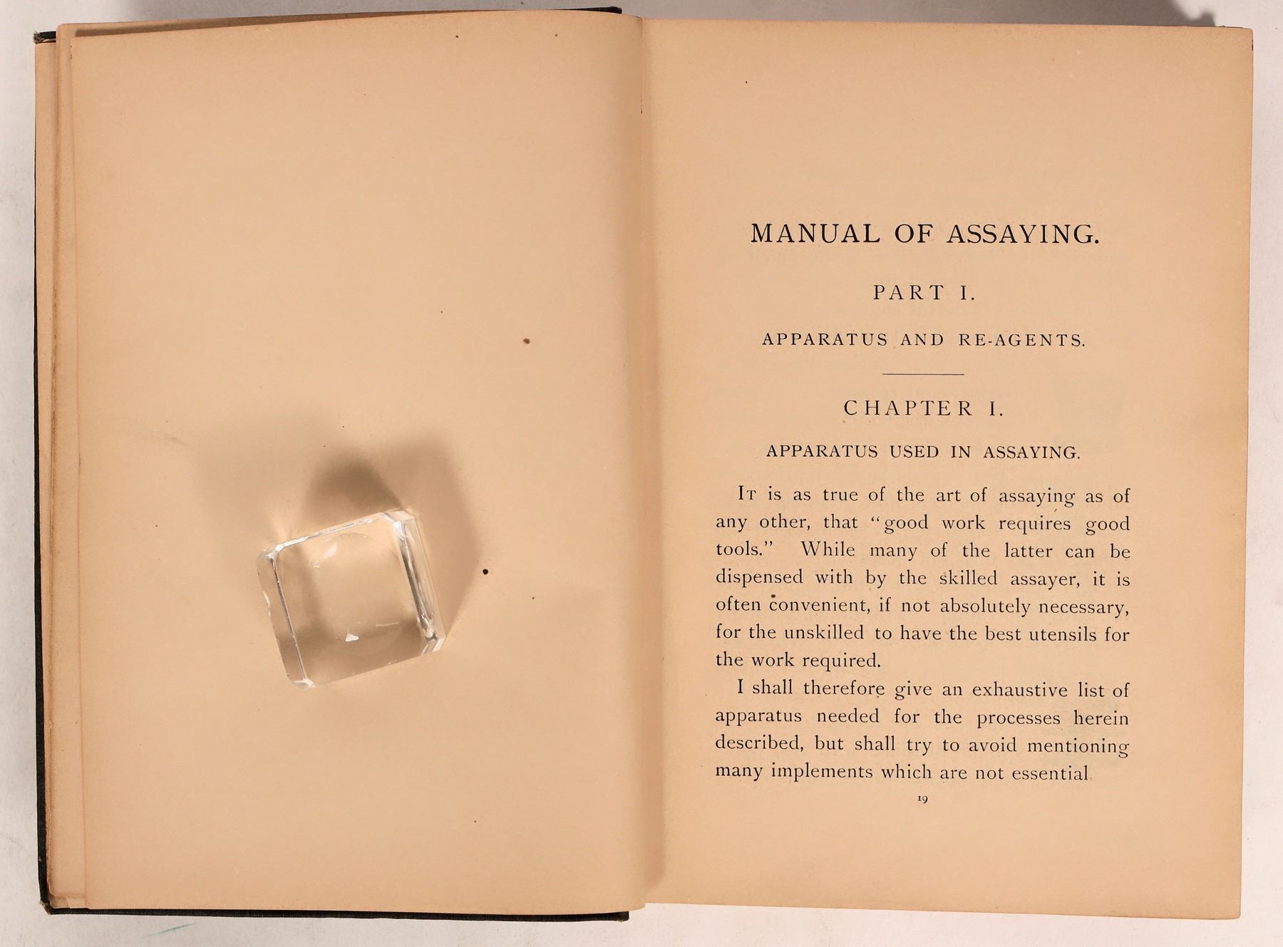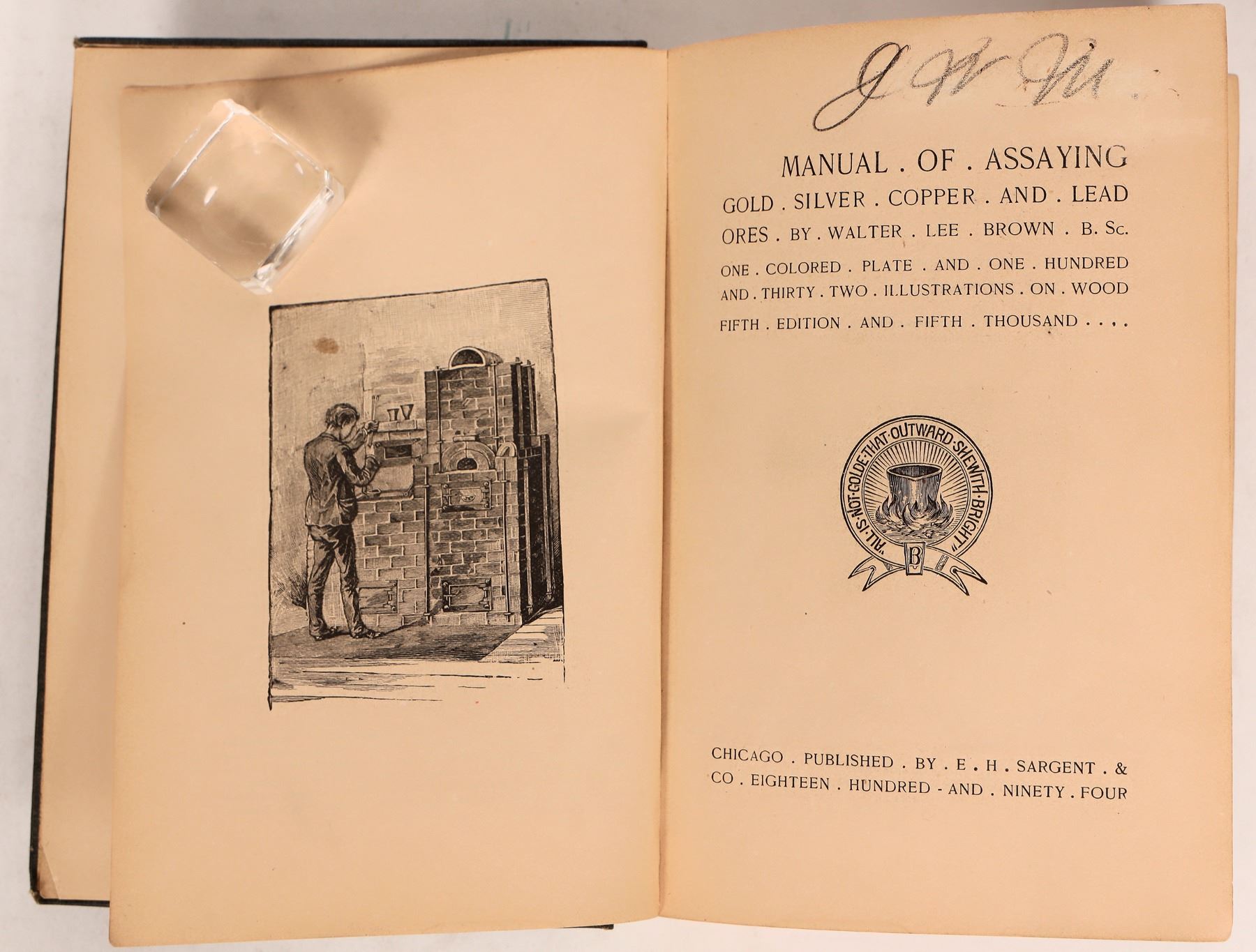 "A Manual of Assaying: The Fire Assay of Gold, Silver, and Lead, including Amalgamation and Chlorination Tests." Alfred Stanley Miller, Professor of Mining and Metallurgy, Univ. of Idaho, 1905. 148 pp. 5" x 7.5". Light scuffs on cover.