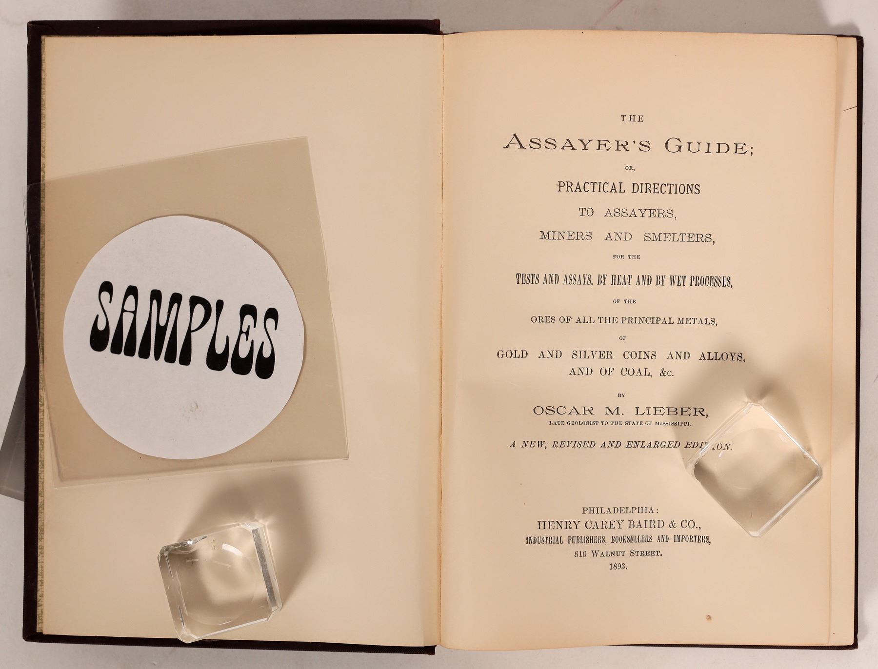 "The Assayer's Guide; or, Practical Directions to Assayers, Miners and Smelters, for the Tests and Assays by Heat and by Wet Processes, of the Ores of all the Principal Metals, of Gold and Silver Coins and Alloys, and of Coal," Oscar M. Lieber, 1893. 283 pp. 5.5" x 7.5". Very good.