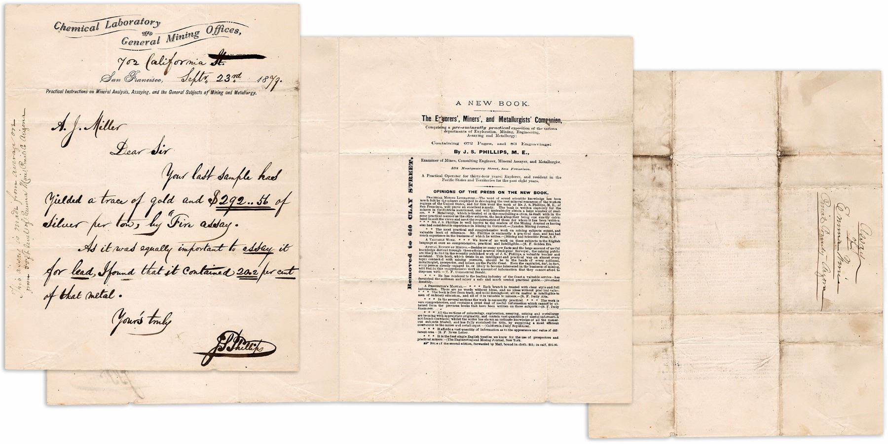 Chemical Laboratory & General Mining Offices Letter sheet Ò J. S. Phillips Ò Located at 702 California St. San Francisco. Earlier in 1873 Phillips had offices at 338 Montgomery St and at 423 Washington St. in San Francisco. See add below Salt Lakes City Directory 1873). This assay report is for the Emma Mine, Pinal County AZ. It is a four-page letter sheet for J. (Josiah) S. (Samuel) Phillips, Assayer, San Francisco, dated September 23rd, 1879. The letter and report refer to samples taken from the 55-foot level, which yielded $292 per ton of silver and 20.2% lead. Phillips was an important assayer and consulting mining engineer in the 1870s and 1880s. His breakout work was a book entitled, The Explorers, MinerÌs and MetallurgistÌs Companion, which he first published in 1872. At the time, this work was considered the most up to date, technical work on assaying. A second edition quickly followed in 1873 (682 pages). A full-page advertisement for a later edition of this book is part of this four-page letter sheet. Ephemera from Phillips is exceptionally rare, and this piece is an R8 and may be Unique. Very Fine. Size: 8 x 10 inches. San Francisco California 1879