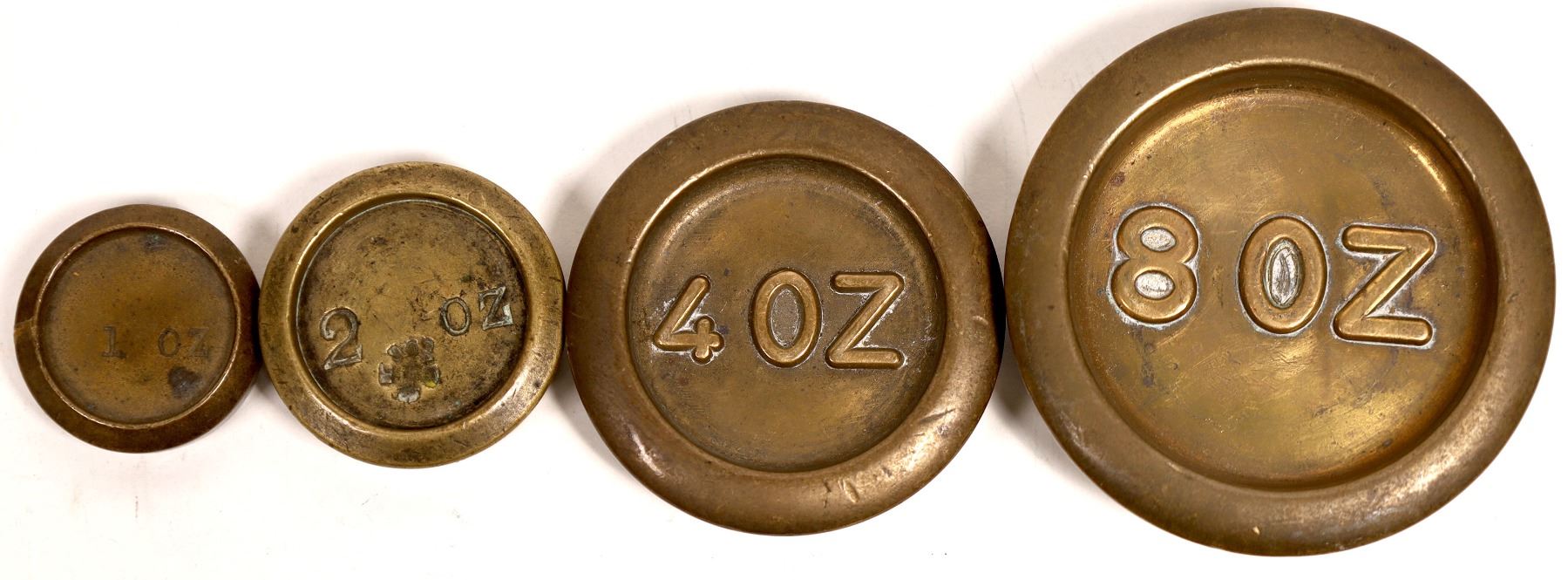 Lot of 4 different brass weights. Includes 8oz (2.25" diameter), 4oz (1.75"), 2oz (1.25"), and 1oz (1"). No makers mark.