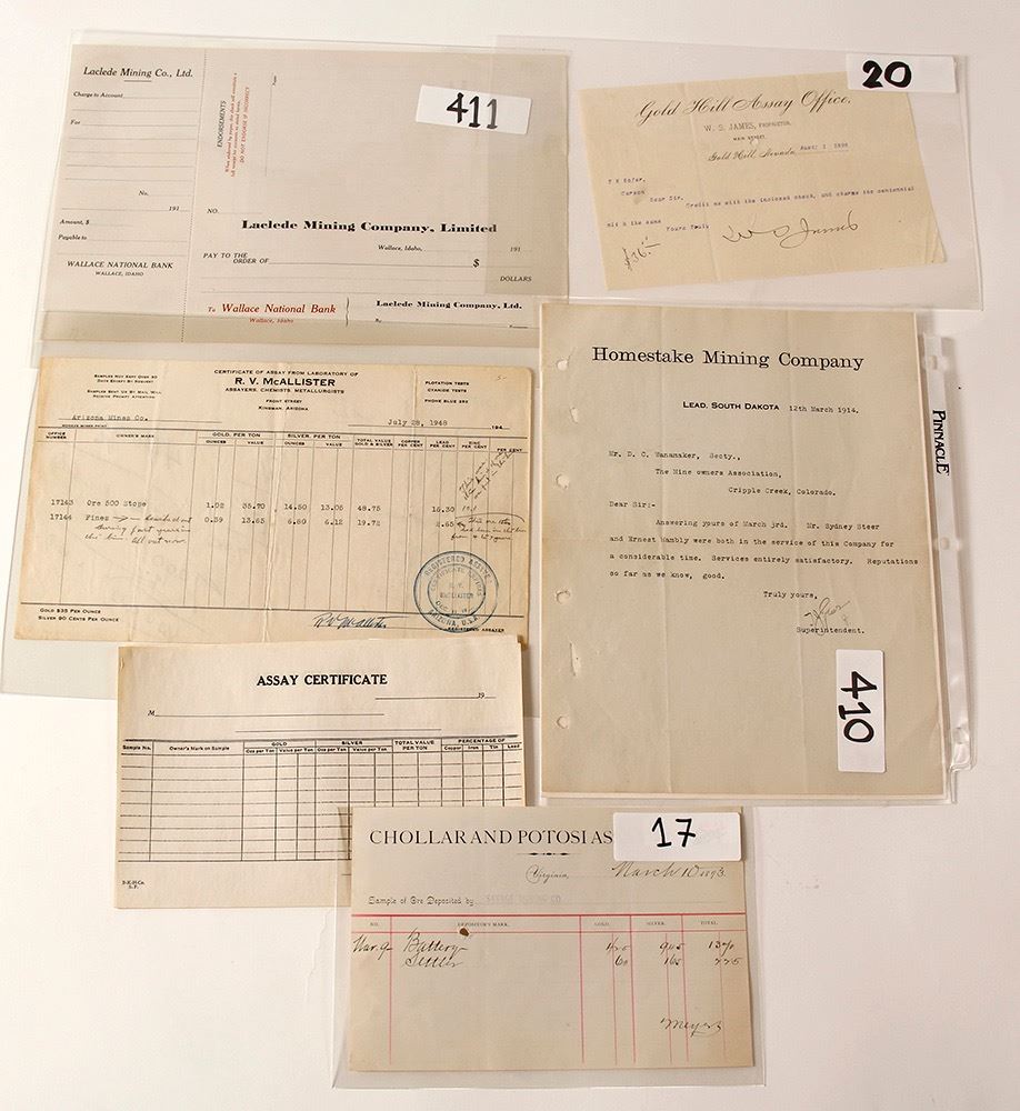 Assay and mining ephemera: 1) two Virginia City assay receipts; 2) Homestake Mining Company, Lead South Dakota; 3) R. V. McAllister, Assayers, Chemists, Metallurgists, Kingman, AZ, certificate of assay; 4) order form from Laclede Mining Co, Wallace Idaho--blank; 5) Blank assay certificates. Date: Location: HWAC# 57814