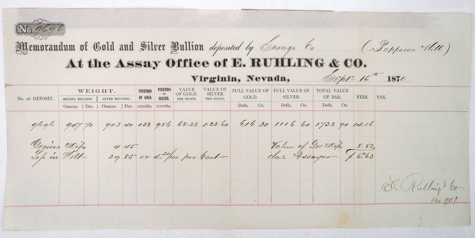 This assay #9696 from the office of E. Ruhling & Co. of Virginia, Nevada for the Savage Mine Co.(Pappoose Mill) dated 1871. The total value is $1732.90 for both gold and silver and signed by E. Ruhling lower right. The Ruhling Co. provided 25 oz. for a silver spike to commemorate the completion of the transcontinental railroad at Promontory Summit in Utah for the CPRR. The Savage Mine is also known for producing a 1000 oz. ingot from its mine at Virginia City. 14 in. X 6.5 inches. Paper residue on reverse (likely from being in a ledger or album)_x000D_