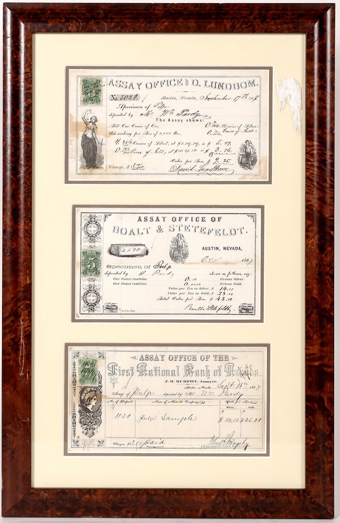 Lot includes three assay certificates for William Pardy from assay offices located in Austin, Nevada, professionally mounted and framed (glass features TruGuard UV protection). Includes: 1) Assay Office of D. Lundbom, certificate No. 3098, datelined Austin, Nevada, September 17, 1867, for a specimen of pulp deposited by William Pardy, with the assay showing 0.7/100 grains of silver and 0.3/10/100 grains of gold. Value per Ton, $9.25. Signed by David Lundbom. Two vignettes: Lady Justice, not blindfolded (left), miner with pick axe (lower right). Green, Nevada State Revenue, $0.05 stamp attached. Minor water stains. 2) Assay Office of Boalt & Stetefeldt, certificate No. 2694, datelined Austin, Nevada, October 21, 1867, for a specimen of pulp deposited by William Pardy, with the assay showing 0.18 grains of silver and 0.0023 grains of gold. Value per Ton, $43.10. Signed Boalt Stetefeldt. Vignette of miner with pick axe (center). Green, Nevada State Revenue, $0.05 stamp attached. Reveille Printers. Minor water stain. FH had the bullion punch for Baolt Stetefeldt. 3) Assay Office of the First National Bank of Nevada, J.R. Murphy, assayer, No. of deposit: 1130, datelined Austin, Nevada, September 11, 1867, for a specimen of pulp deposited by William Pardy, with the assay showing $14.13 of silver and $25.01 of gold per ton. Signed John R. Murphy. Vignette of cameo of woman (left). Green, Nevada State Revenue, $0.05 stamp attached. J.D. Fairchild & Co, Printers. Daily Reveille Office. Minor water stain. William Pardy is not mentioned in ABBE, but possibly worked for the Mills, Post & White Consolidated Silver Mining Company as secretary in 1864. Franklin Collection.