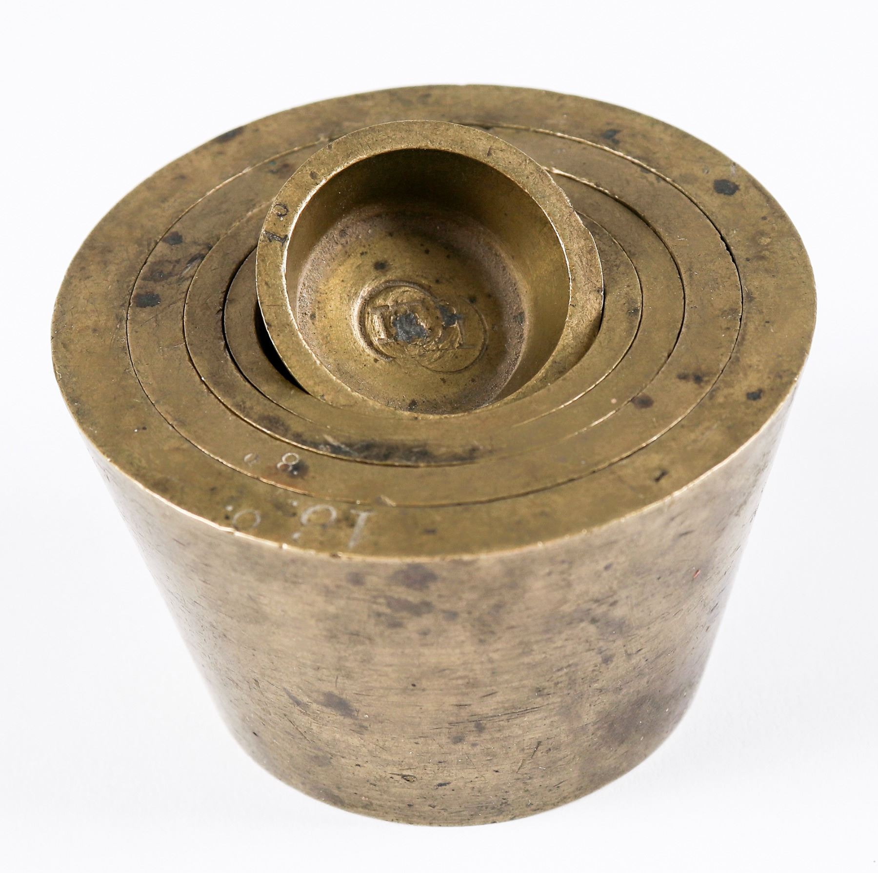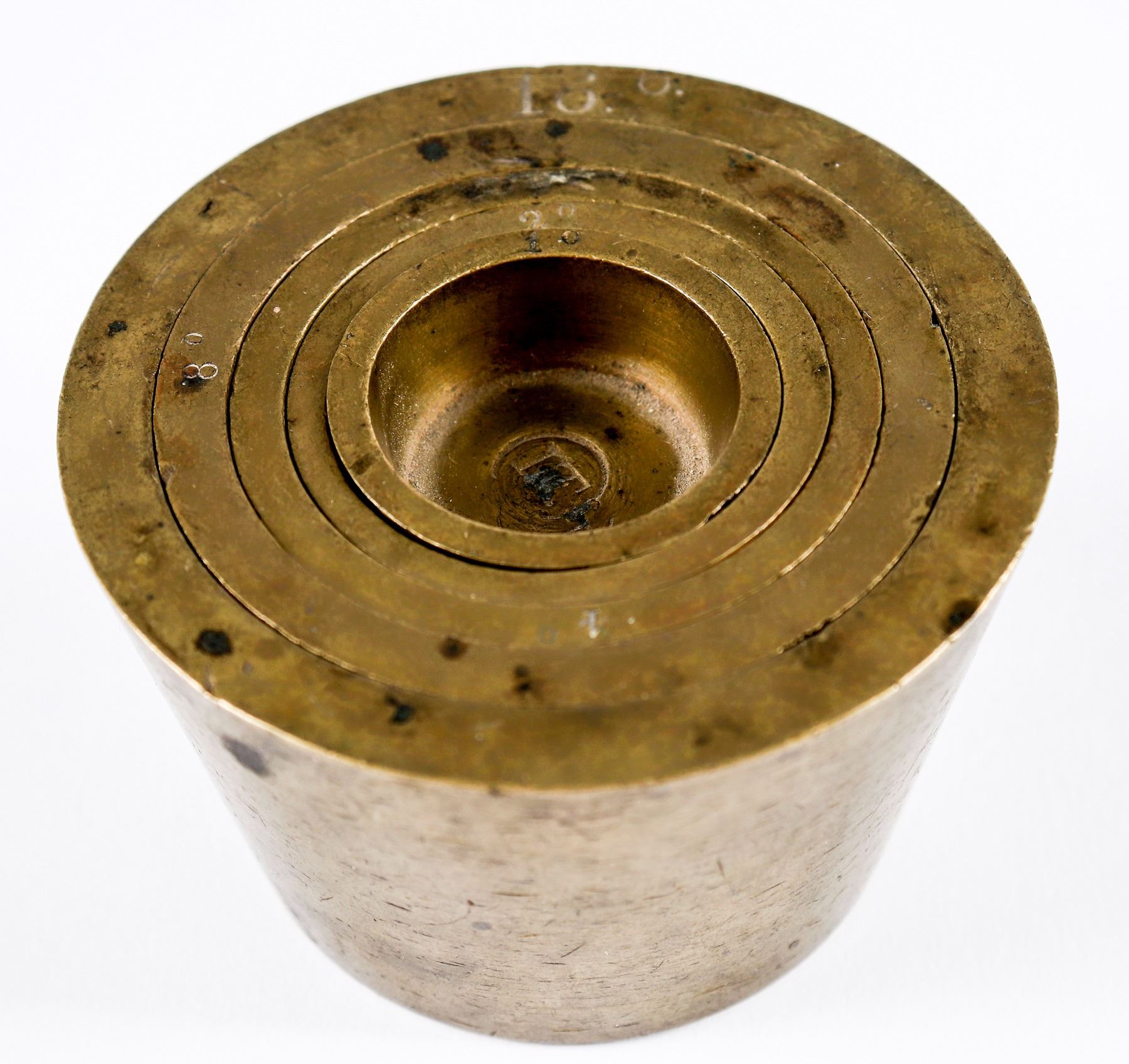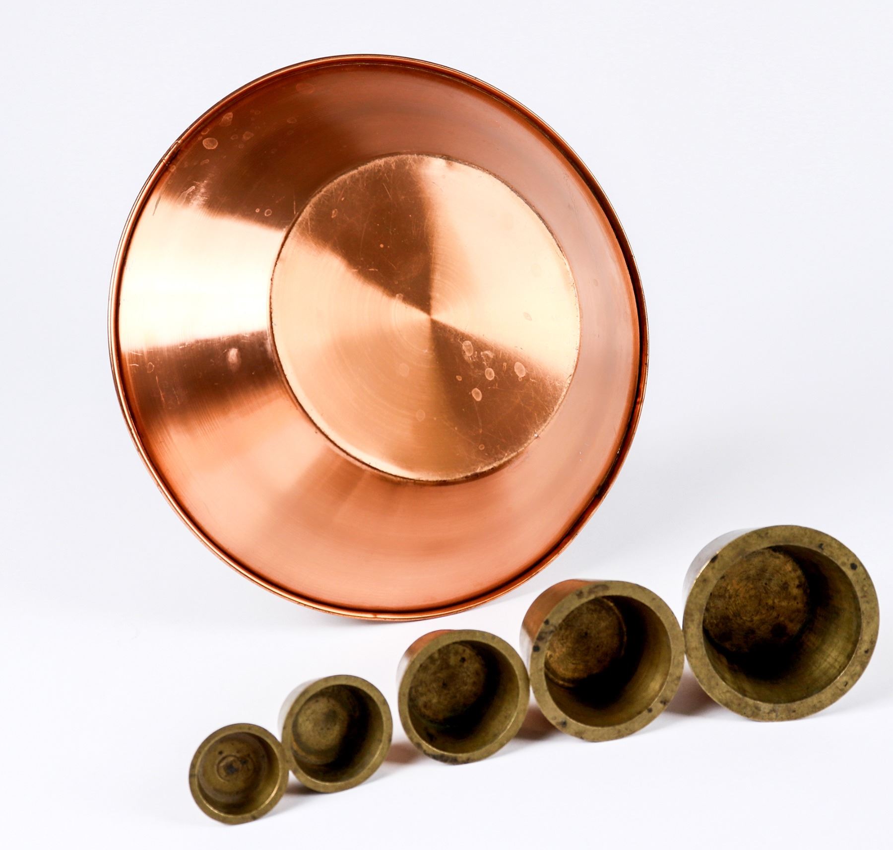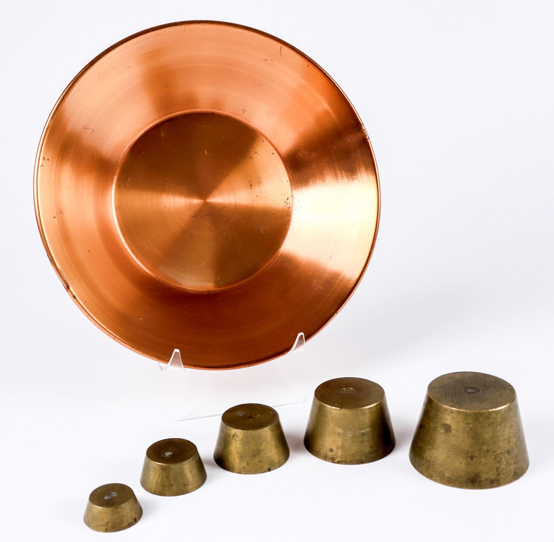Brass nested weight set for assaying. 5 weights from 1.0 to 16.0. Stamped I T in center of 1.0 weight. Copper plated copper decorative mining pan, 9" diameter.
