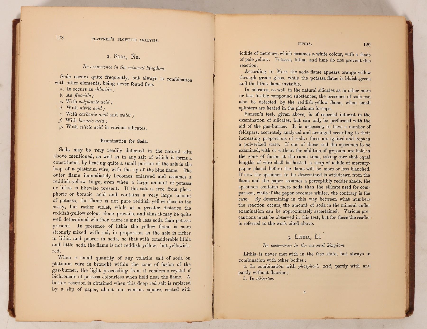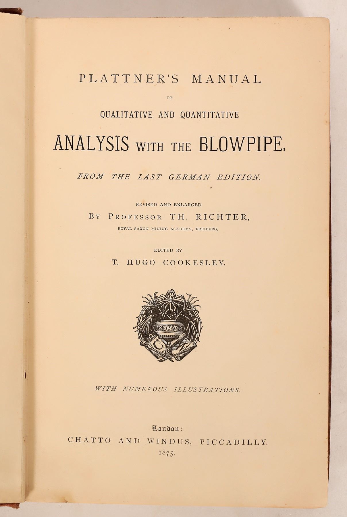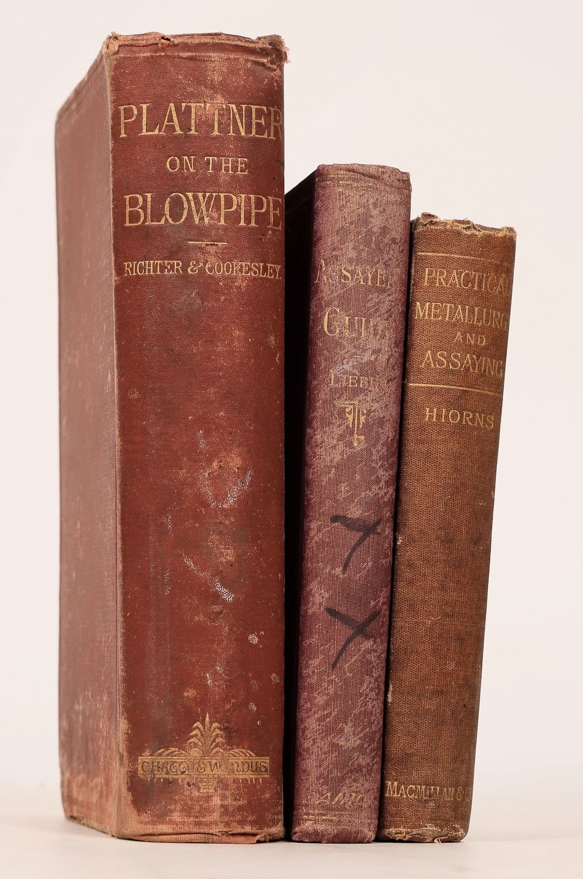 Assaying group. 1888 Practical Metallurgy and Assaying by Hiorns, 471pp with index. Foxing, binding and corner wear, spine faded. 1893 The Assayers Guide by Oscar Lieber, 283pp with index. Binding has wear and faded spine. 1875 Plattner's Manual of Qualitative and Quantitative Analysis with the Blowpipe by Professor Th. Richter, 515pp with index. Foxing, some water damage, binding wear especially on bottom. Please inspect.