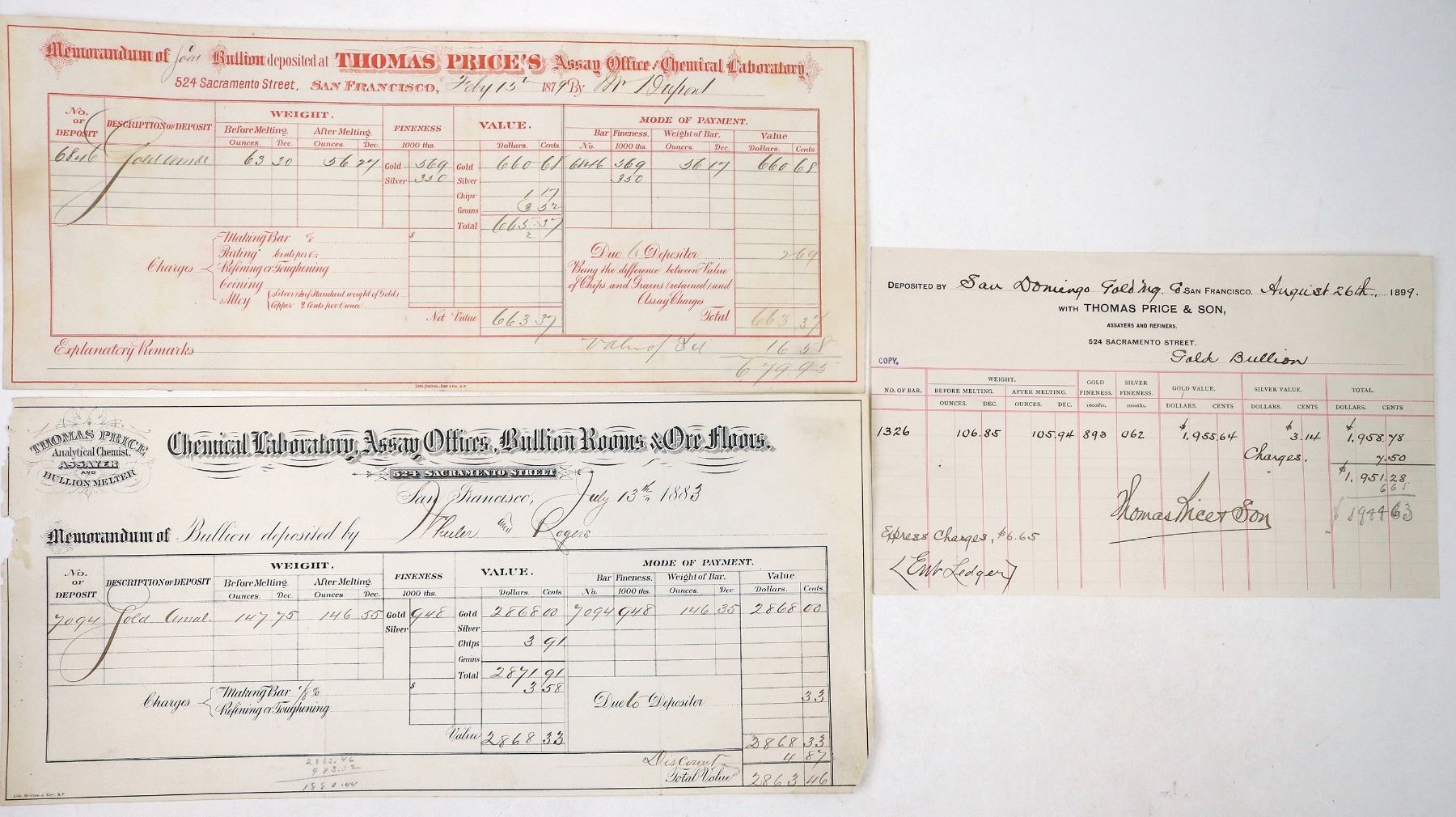 These are three assays from Thomas Price of San Francisco dated 1879, 1883, and 1889. Thomas Price ingots are extremely rare: about four silver ingots are known, and one gold ingot is known. The assays are almost as rare. Price, a native of Wales, was a graduate of the Royal School of Mines, London and worked in Swansea where the world's copper was smelted. California ore was also sent there where he learned of California gold. He relocated to San Francisco in 1862 working for Kellogg & Hewston later San Francisco Assay and Refining Works and still later his own assay company. He was known as Professor Price for teaching assay at two California colleges. The assay #6846 of 1879 is red ink on cream paper with 56 oz. of low grade gold amalgam with silver for a value of $679.95. The depositor was W. DuPont. Minor fold crease no foxing in very good condition. The assay #7094 of 1883, black ink on white paper, deposited by Wheeler & Rogers is for 147.75 oz. of gold for a fineness of .948 valued at $2863.46. Three fold creases one chip lower right and upper left. Printed by Britton & Rey of S.F. Fine condition. The third assay is on Thomas Price & Son letterhead dated 1889. Gold Bullion from San Domingo Gold Mining Co. #1326 bar at 106.85 oz. fineness of .893 for a value of $1944.63. Arithmetic on the back; three fold creases no foxing. Signed Thomas Price & Son. Please see photo for details.