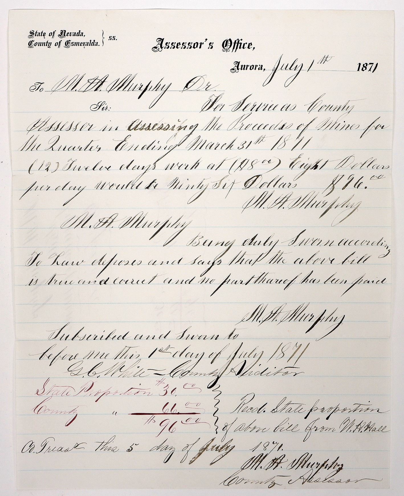 Rare. Official form for the Assessor's Office, Aurora, State of Nevada, County of Esmeralda, July 1st, 1871. Issued to MA Murphy, county assessor, for work done assessing the proceeds of the mines. Signed by Murphy and GC White. 9.75 x 7.5" Murphy is described in Thompson & West (1881, pg. 84). He came to Aurora in 1863 and worked in mining. He then served as county assessor, district attorney, and later Attorney General for the State of Nevada.