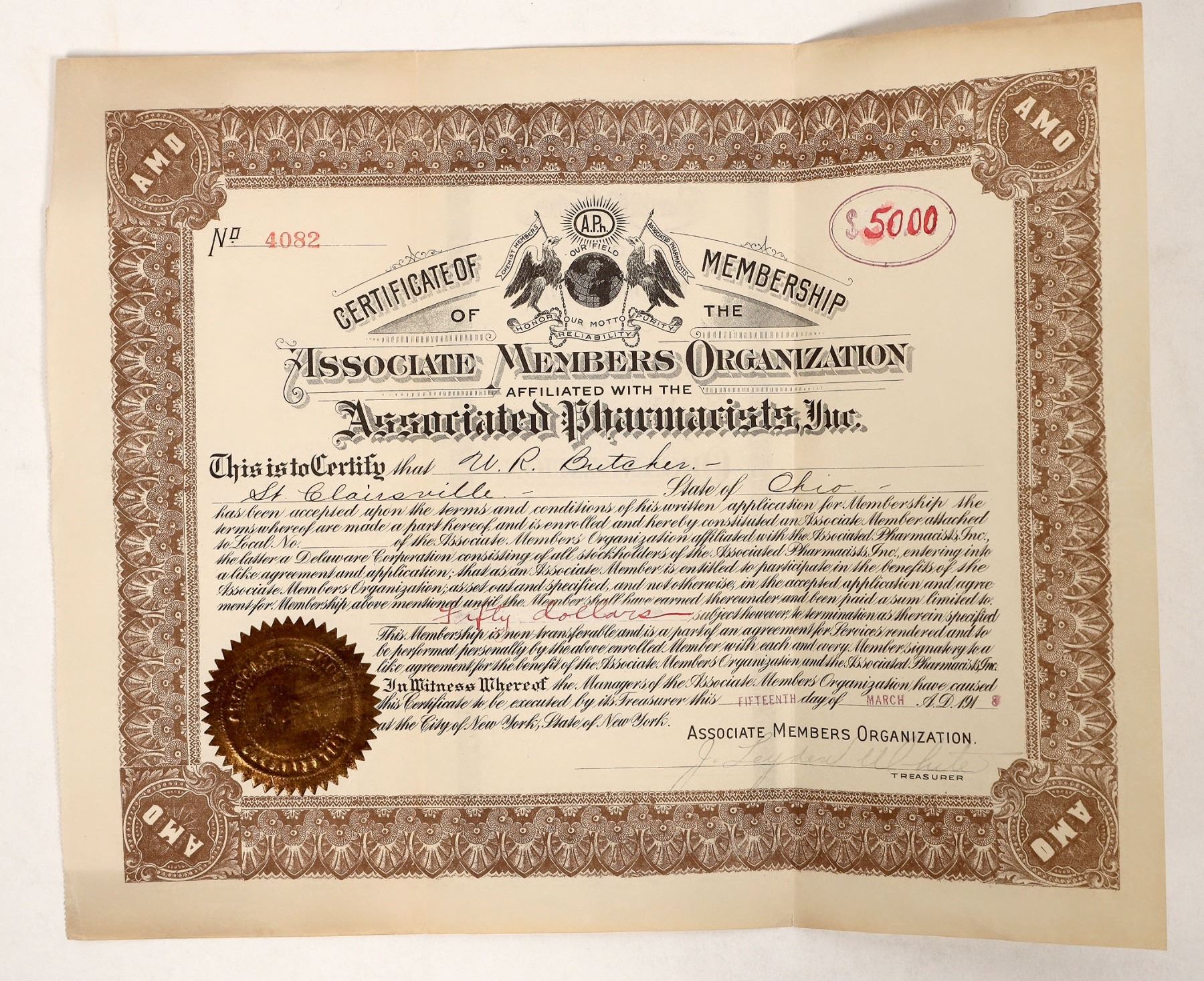 Rare 1918 Associated Pharmacists membership certificate. Issued to W R Butcher.