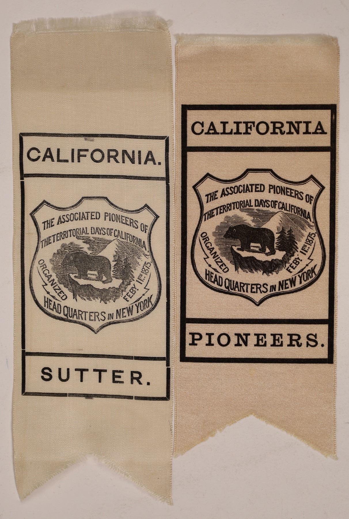 Lot of two delegate ribbons from the Associated Pioneers of The Territorial Days of California, organized Feb. 11, 1875, headquarters in New York. One yellow (Pioneers) and one off white (Sutter). The Associated Pioneers of the Territorial Days of California was formed in New York in 1875 by General Horatio Gates Gibson (1827-1924) with the assistance of Francis D. Clark. The Society's objective was "to form a more perfect union of the Pioneers of California, now residents of the Atlantic States, and to cultivate social intercourse between them" (Article 1, Articles of Association). The organization was primarily composed of Mexican War veterans of the Army and Navy, gold hunters, politicians, and businessmen "who were for any period in California prior to the 9th day of September, 1850 (the date of the admission of the State of California into the Union)" (Article 6, Articles of Association). At its inception, the organization was made up of 49 members who were among the elite of the California gold rush and military history. Members included: John A. Sutter, Joseph Hooker, John Fremont, Cornelius Vanderbilt, W.T. Sherman, Stephen L. Merchant, Francis D. Clark, and E. Kemble.