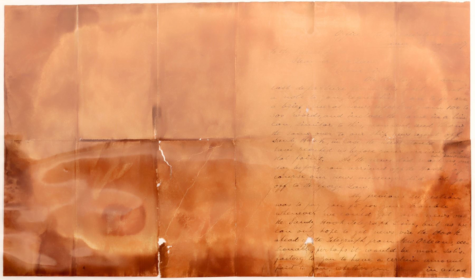 Four page folded letter, not on pre-printed stationery. "From the office of the Associated Press", May 20, 1857, to "the Purser of the SS George Law". This letter nearly duplicates the letter of the Associated Press from April 20, 1857. This letter, also carefully preserved by the Northeast Document Conservation Center, is easy to read. It discusses the necessity of receipt of news from the George Law at Sandy Hook, sent to New York by telegraph. Two and a half pages, signed by the agent.