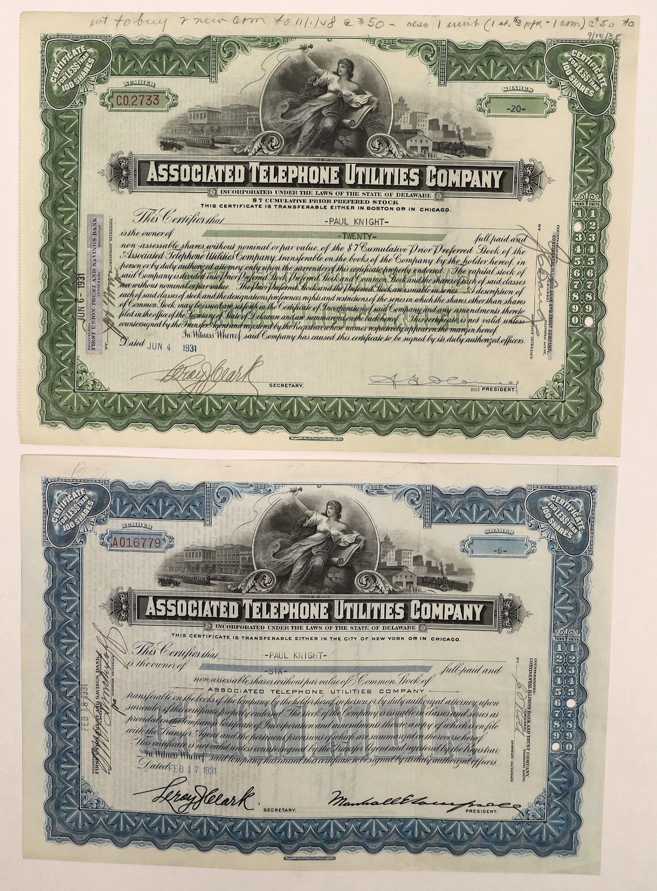 Lot of 2 different. Inc. in Delaware. Both issued in 1931 to Paul Knight. Not cancelled. Blue or green borders, black print, and nice vignette with a woman holding a phone with city scenes in the background. Republic Bank Note Co., Pittsburgh. The Associated Telephone Utilities Company was a Wisconsin-based power company that went bankrupt in 1933, during the Great Depression. Prior to the Depression, the utility was a prominent player in the electrical power business in the Midwestern United States.