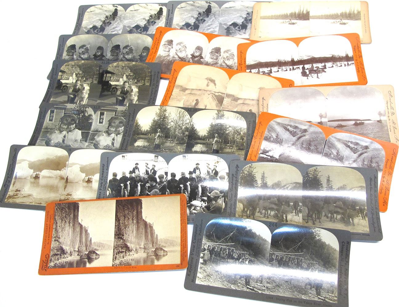 Keystone-2 Willi Campbell on a sled with dogs, 2x three frost faced prospectors at 62 degrees below zero!, sleds at Haines, going up the Yukon River, big ice on the Allenkaket River, a boy and dog, The Dying Klondiker?, several female photos, drying fish, government reindeer at Haines, salmon. Underwood & Underwood-icebergs at Taku Inlet. Pacific Coast Views-Cape Horn. Date: Location: Alaska HWAC # 54947