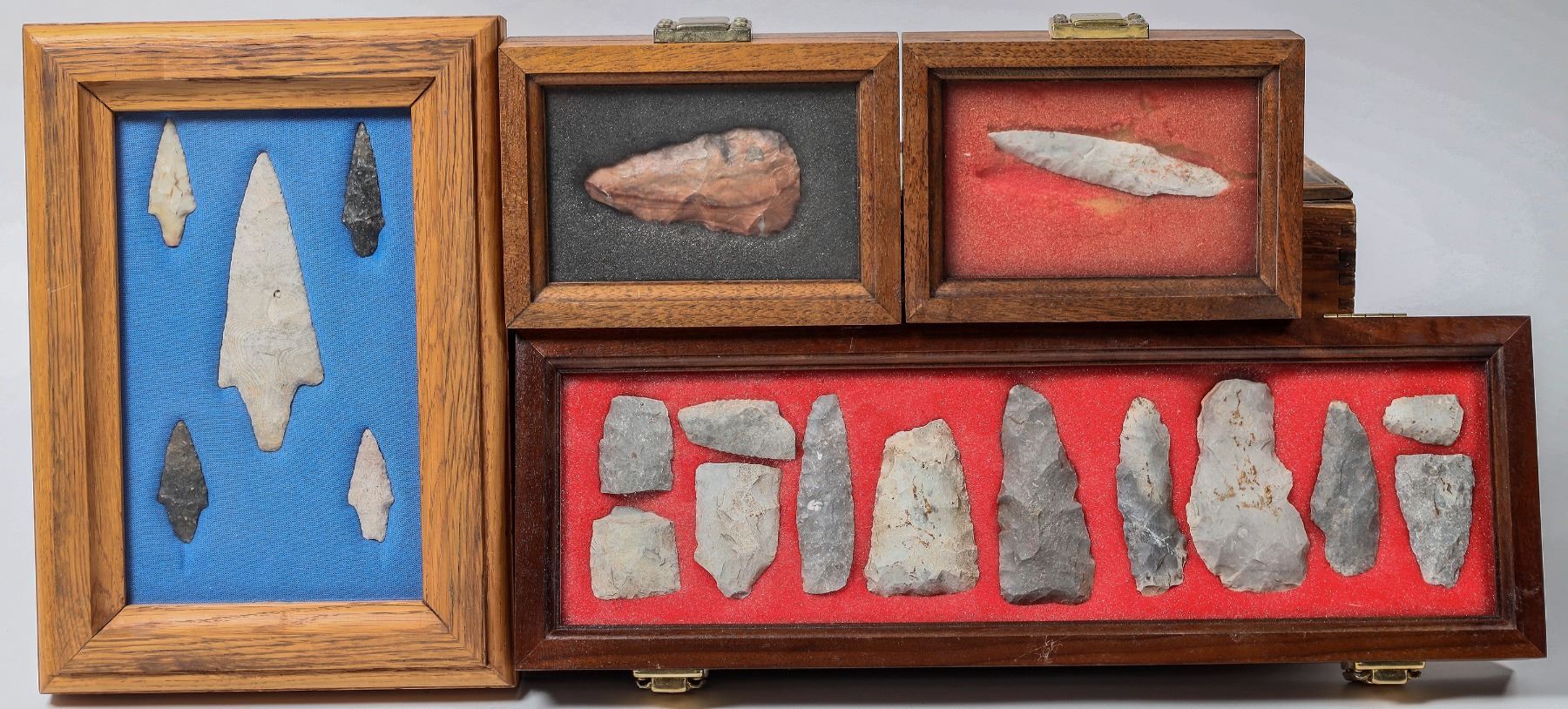 This lot contains 24 points in four display boxes from the Ponca, Oklahoma area. One frame contains points similar to Dickson or Adena points found on the Arkansas River near Ponca. Size varies from 1.5 in./39 mm to 5.0 in./127 mm. The largest point appears to be as striped chert. 10,000 to 8,000 B.P. Please see photos for details. State: Oklahoma, Provenance: Gary Bracken Collection