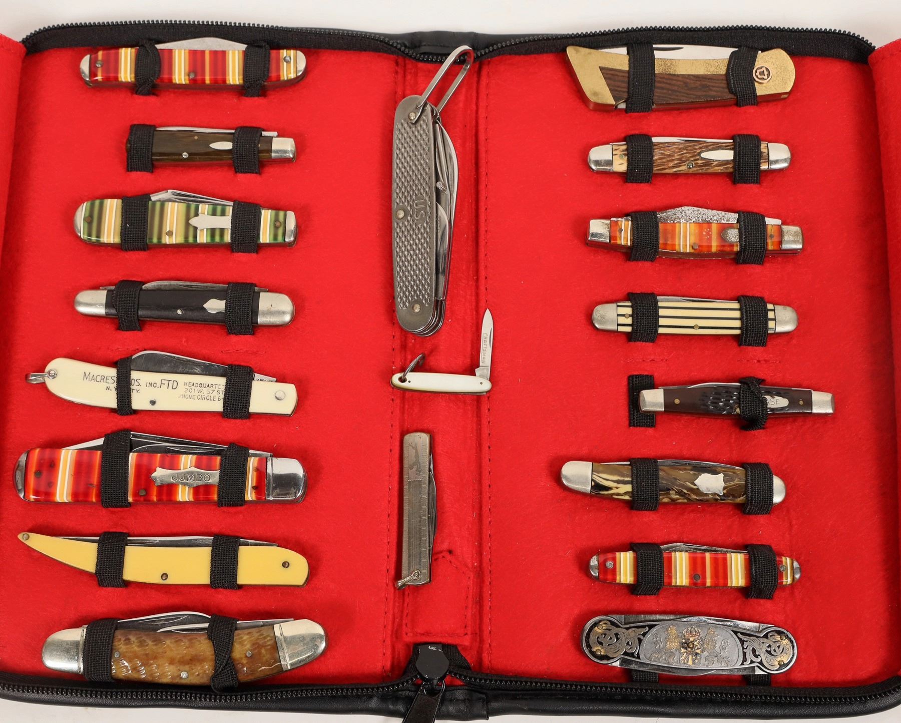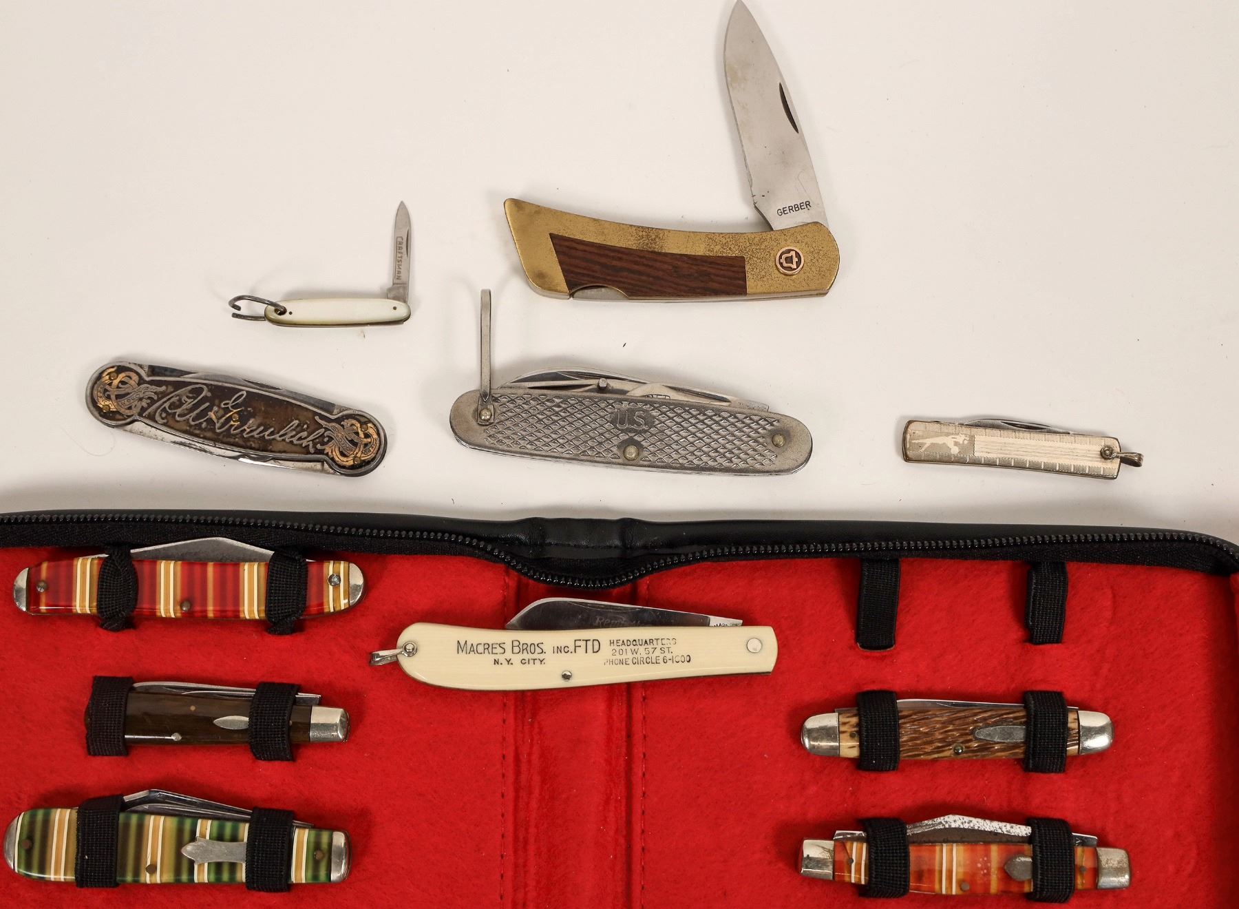 This group has 19 folders. There is a Emil Olsson 4-blde with the Sweden Coat of Arms 3 in. made for R.W. Grrulich; a Camillus Jumbo candy cane red-orange-yellow at 4.5 in. and 7.5 in. open chipped scale; a Supreme cutlery candy cane R-O-Y 3.5 in./ 6 in. open 3-blade needs polishing; a Kabar toothpick with yellow scales single blade 4.375 in./ 7.625 in. open; Bridge cutlery 3-blade lightly used 4in./ 7 in. open; a Craftsman pen knife single blade 1.5 in./ 2.625 in. open with faux mother of pearl scales; a Keen Kutter 9610 with ebony scales and shield 3.375 in./ 5.25 in. well used 2 blade E.C. Simmons; a U.S. Imperial folder 1964 4-blade tool; a Remington knife single blade 3.785 in./ 6 in. open cream white colored scales/ a Schrade 2-blade 3.25 in. /5.125 in. candy cane 2-blade that needs polishing. Plus others. Please see photo for details.