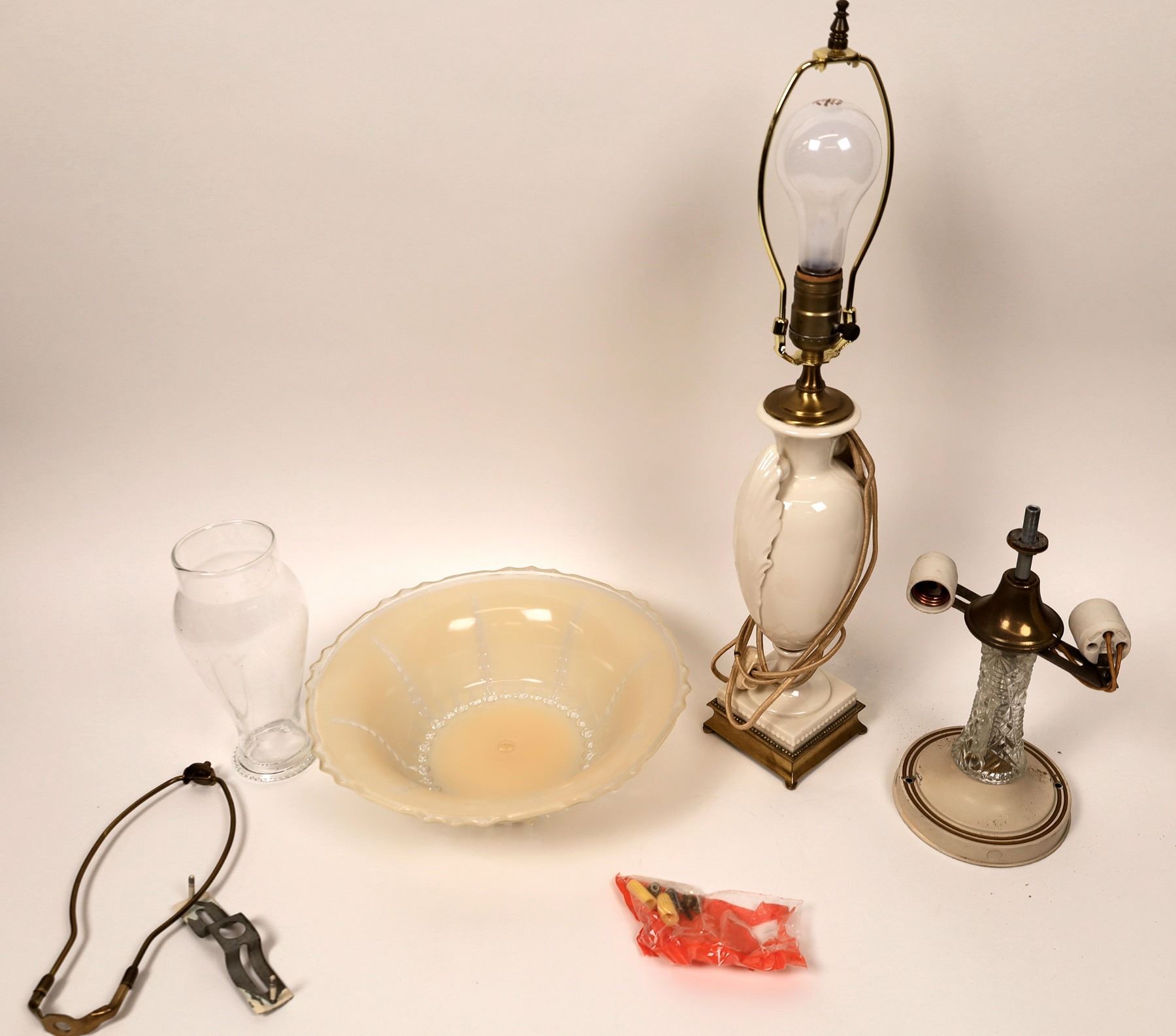 Small group of lighting fixtures, including a vintage table lamp, a lantern chimney a small nightstand lamp and a large glass shade. Please see photos for more detail and condition.