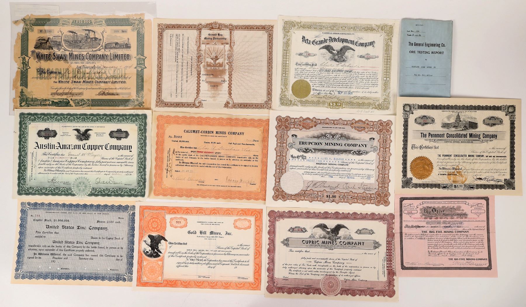 Assorted mining stock certificates, five unused. Included are Cupric Mines Company, Gold Hill Mines Inc, Penmont Consolidated Mining Company, United States Zinc Company, Ground Hog Mining Partnership, The Big Five Mining Company and more. There's also an ore testing report dated 1911 on ore from Highland, Oregon. Please see photos for more details. 1900s