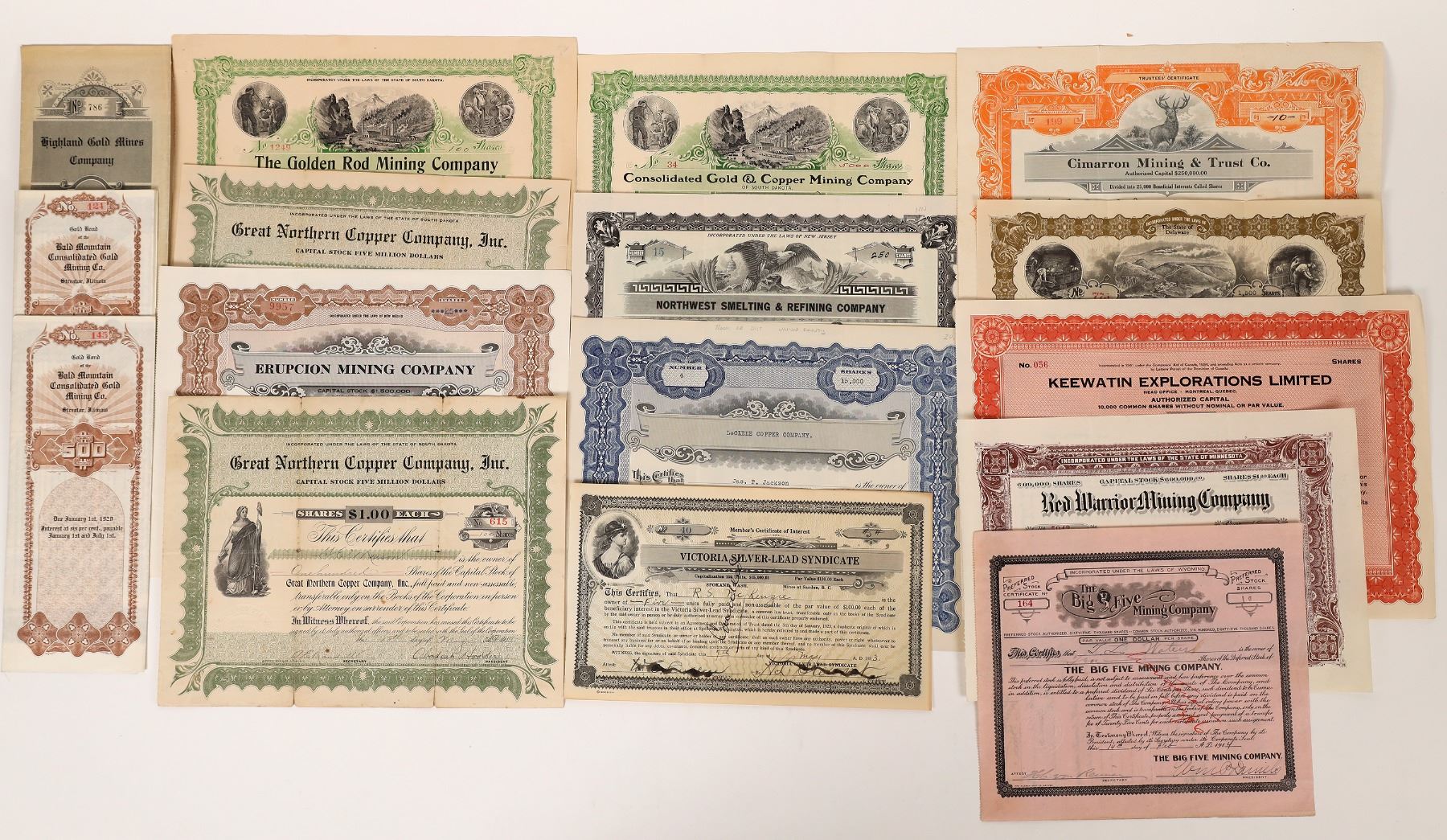 Mix of 16 mining stocks and bonds. Stocks-Big Five Mining, Keewatin Explorations, Canadian Copper Mines, Cimarron Mining, Great Northern Copper, LeClede Copper, Northwestern Smelting, Victoria Silver-Lead, Cons. Gold & Copper Mining, Erupcion Mining, Great Northern Copper, Golden Rod Mining, Red Warrior Mining. Bonds-2x Bald Mountain Cons. Gold Mining, Highland Gold Mines.