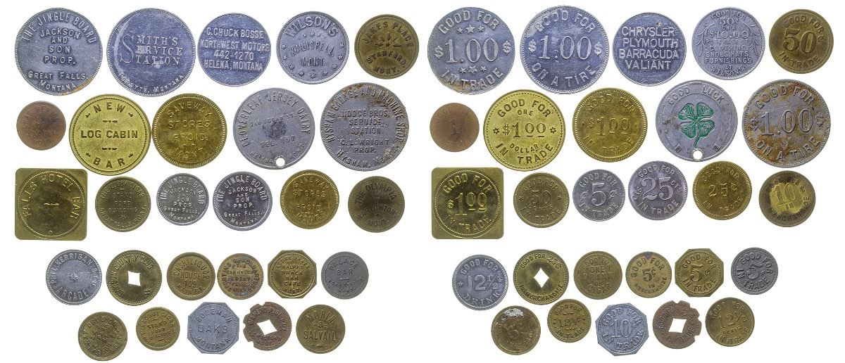 26 Tokens from all over Montana and it includes 2 R-6's, 14 R-5's, and 10 R-4's and lower. Also includes a full R-5 complete set for The Jungle Board. Highlights are R-6 Diamond Pool Hall / Lewiston, / Mont. // GF 5c / IT. Round with 4 Notches, Cut Diamond, Brass, 21mm. R-6 Chas. Herman, Laurel, Mont. // GF / 1 / Drink. Round, Copper, 22mm and many more. See photo. City: State: Montana Date: Inventory# 40137