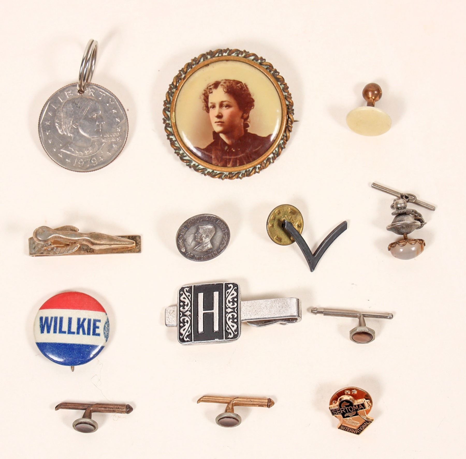 Eclectic mix of pins and buttons. Wilkie, old lady pin, Army chevron, Susan B Anthony quarter key ring etc. See photo.