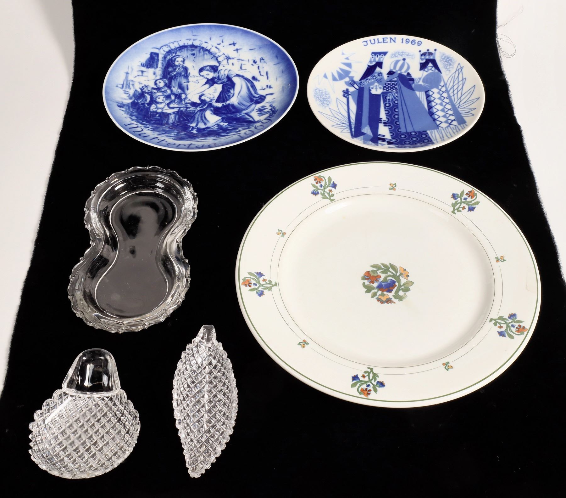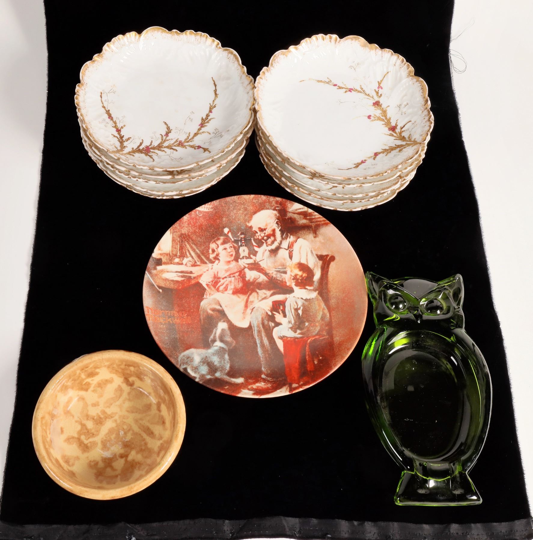 10 7" plates with branch pattern by Limoges, France. 1977 Norman Rockwell plate by Knowles, # 28066R, 8.25". Missouri Pacific by O. P. Co, St. Albans, copyrighted 1915, 9.75". Brown bowl 2x5". Green owl ashtray 8.5x4.75". Figure 8 7.25x4". Set of 2 figural nut dishes 2x4.75" and 4x3". 1969 Norwegian Christmas plate 7". Mothers Day 1969 plate by Bareuther 7.75".