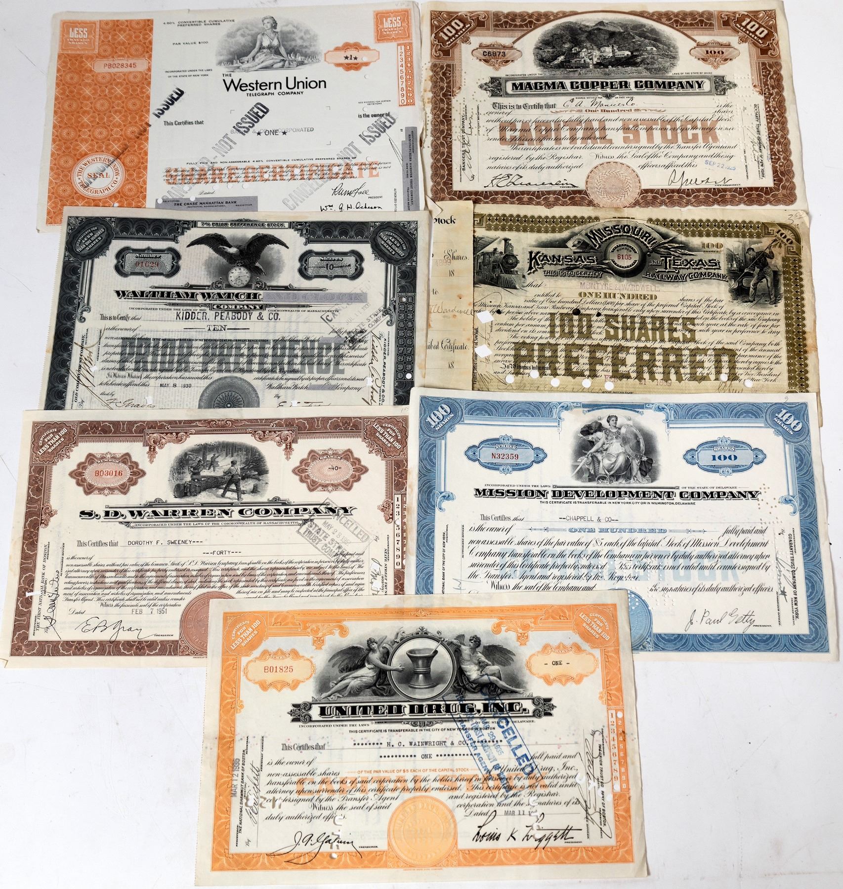 7 different stocks. Missouri, Kansas and Texas RR. SD Warren. Waltham Watch. Mission Dev. United Drug. Magma Copper. Western Union.