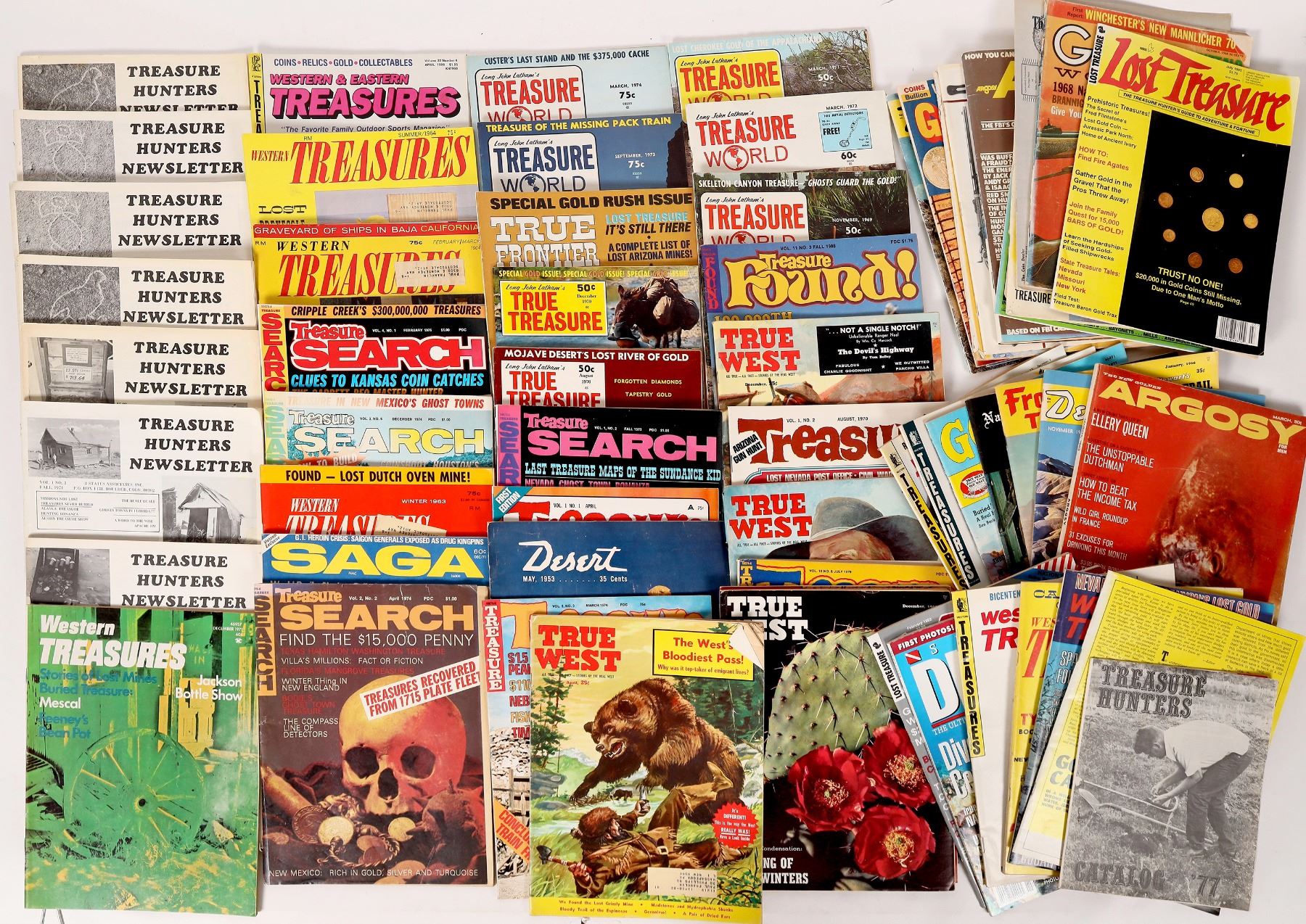 Lot of (x303) magazines related to treasure and treasure hunting. c1950s-1980s. All are related to treasure and gold hunting. Magazine titles include but are not limited to: 1. True Treasure (Long John Latham's) 2. Treasure Hunters Newsletter 3. Treasure Search 4. Treasure Frontier 5. Saga 6. Western Treasures 7. Treasure World 8. Treasure (includes first edition) 9. Treasure Found 10. True West 11. Gold Prospecting 12. Desert 13. Frontier Times 14. Life 15. Gold Prospecting News 16. Lost Treasure 17. Western Fiction (Long John Latham's) 18. Big West 19. Modern Gold Miner and Treasure Hunter 20. International California Mining Journal 21. Argosy 22. Sport Diver 23. Gun World 24. The Coin Dealer 25. The Classic Collector 26. Coin Prices 27. Coins 28. Western Treasures 29. Western and Eastern Treasures 30. True Treasure31. Real West. Franklin Collection Franklin Collection