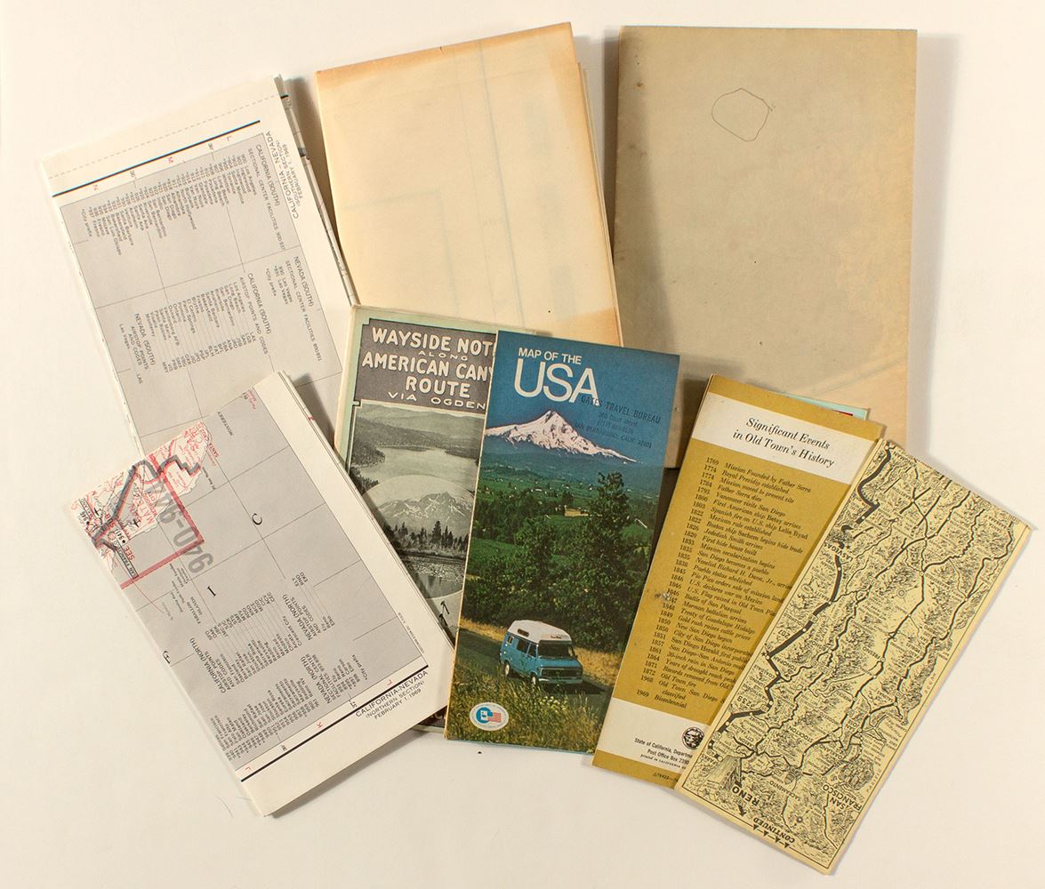 Includes: Southern Pacific Ogden, Pan-Am West (Alaska to Mexico), Old Town San Diego, Dallas/Forth Worth brochure, two California and Nevada postal maps (c. 1969), Map of US, 1932 map of the world from National Geographic, and a soil map (c. 1909) showing central Nevada.