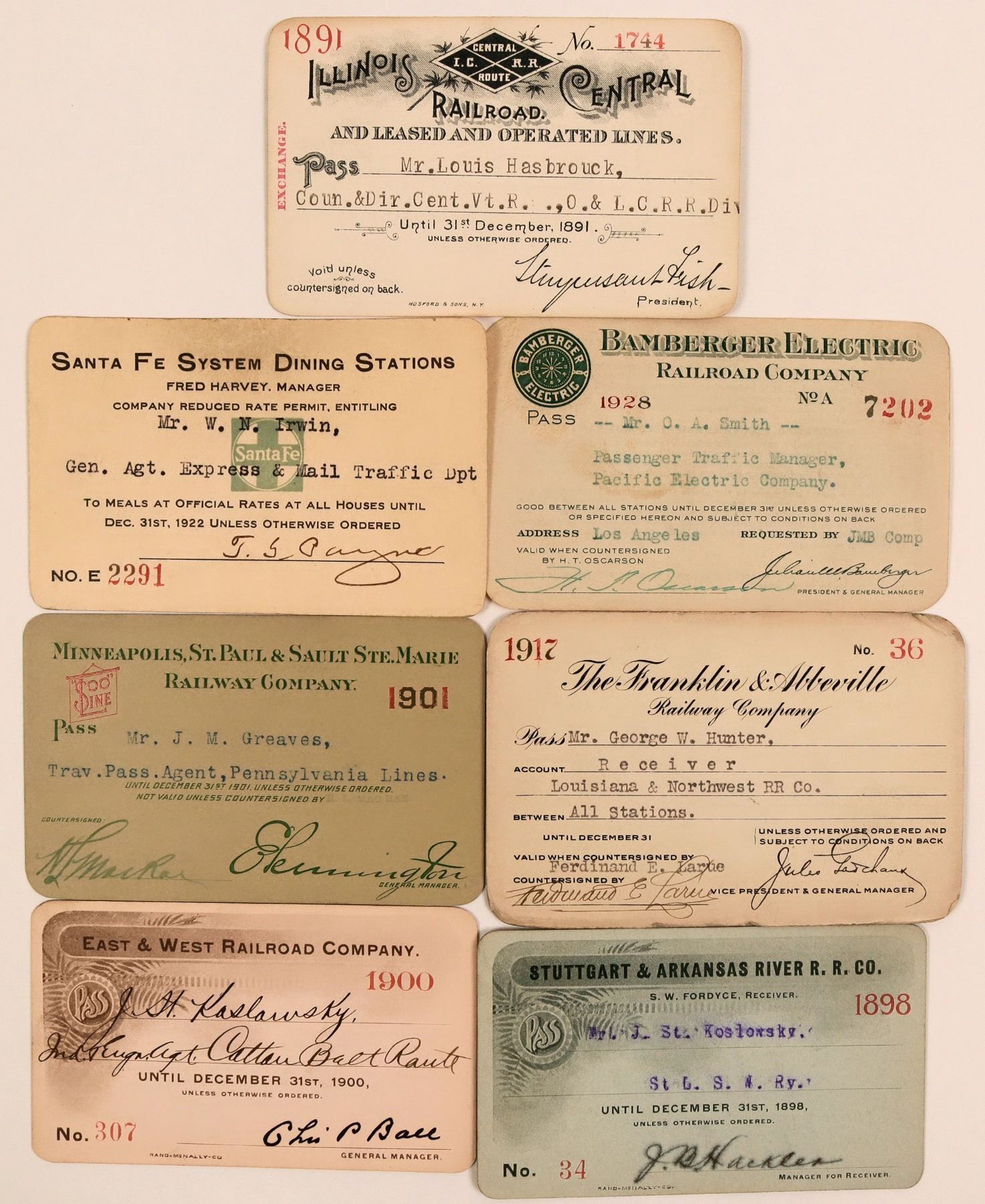 Lot of 7 different. Includes: Illinois Central Railroad, 1891; Stuttgart & Arkansas River Railroad Company, 1898; East & West Railroad Company, 1900; Minneapolis, St. Paul & Sault Ste. Marie Railway Company, 1901; Franklin & Abbeville Railway Company, 1917; Santa Fe Dining Stations, 1922; and Bamberger Electric Railroad Company, 1928.