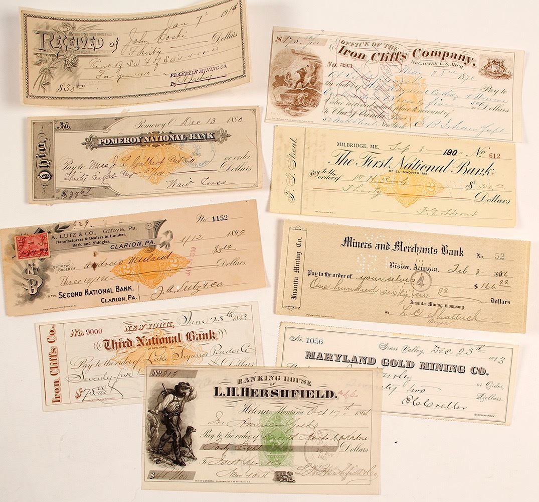 Checks from LH Hershfield, Helena, MT 1864, Third National Bank 1883, A. Lutz & Co. 1899, Maryland Gold Mining 1893, Iron Cliffs Co. 1870, First National Bank 1900, Juanita Mining 1926, Pomeroy National Bank 1880. 1914 receipt from Franklin Mining. Date: Location: HWAC# 56174