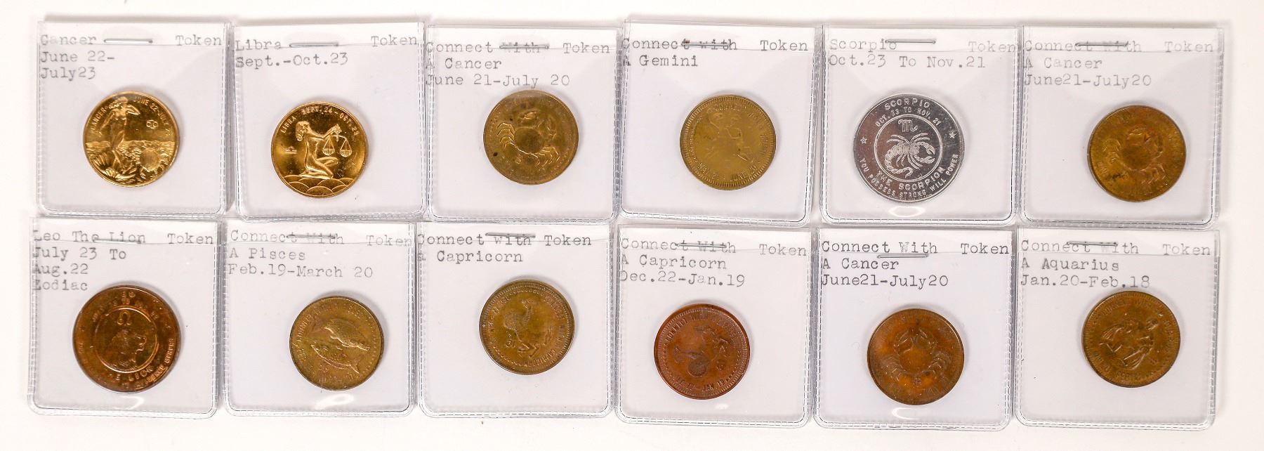 Lot of twelve astrological medals, mostly brass: Cancer (4); Capricorn (2); Gemini; Pieces; Libra; Scorpio (white metal); Aquarius; Leo. All about 28 mm.