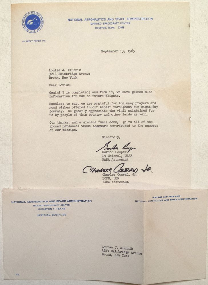 Written on letterhead of NASA. Response to congratulatory letter. Date: 1965 hwac 2745
