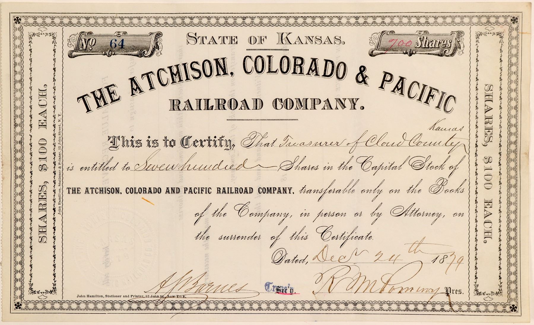 Stock Certificate from the Atchison, Colorado & Pacific Railroad Co. Incorporated in 1879. Certificate number 64 issued in 1879 at Kansas to Treasurer of Cloud County. Signed by R. M. Pomeroy and A. P. Barnes. Printed by John Hamilton / New York, size 10" by 6 1/16". Nice with light staining. Plain, no vignette. From the State of Kansas. Small size as noted. The Atchison Colorado & Pacific Railroad Company was a consolidation of the Waterville & Washington Railroad Company, the Republican Valley Railroad Company, the Atchison Republican Valley & Pacific Railway Company, the Atchison Solomon Valley & Denver Railroad Company and the Atchison & Denver Railway Company. This road was leased to the Central Branch Union Pacific Railway Company.
