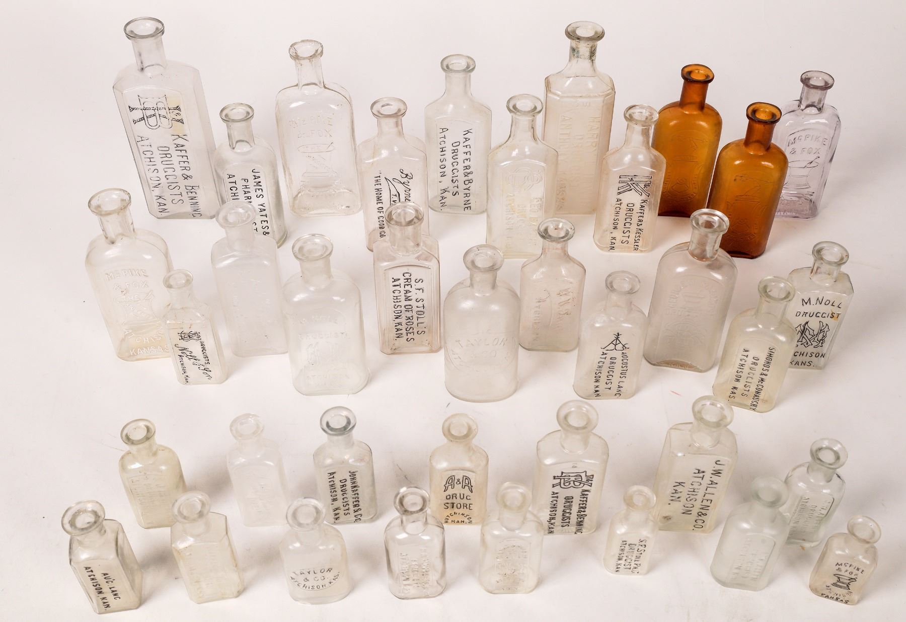 Hoard of Atchison medicine bottles. Fletcher lists dozens of examples. Kaffer & Benning 6.75". SF Stoll's 5". M. Noll's 5". 2x Amber Chapman 5.25". McPike & Fox 5". Geo Barton 5.5". Taylor 4.75". Kaffer & Byrne 5.25". JW Allen 3.5". Kaffer & Kessler 5". Bereman & Stevens 3.5".Kaffer & Benning 4.25". Aug Lang 3.25". W U Ingham 4.25". For these named bottles, no cracks or significant defects. There are 23 more Atchison bottles in Bracken's paper wrapping that are not described or inspected. This collection is a great starter group or to add to your existing Atchison collection with at least 2 desirable ambers.