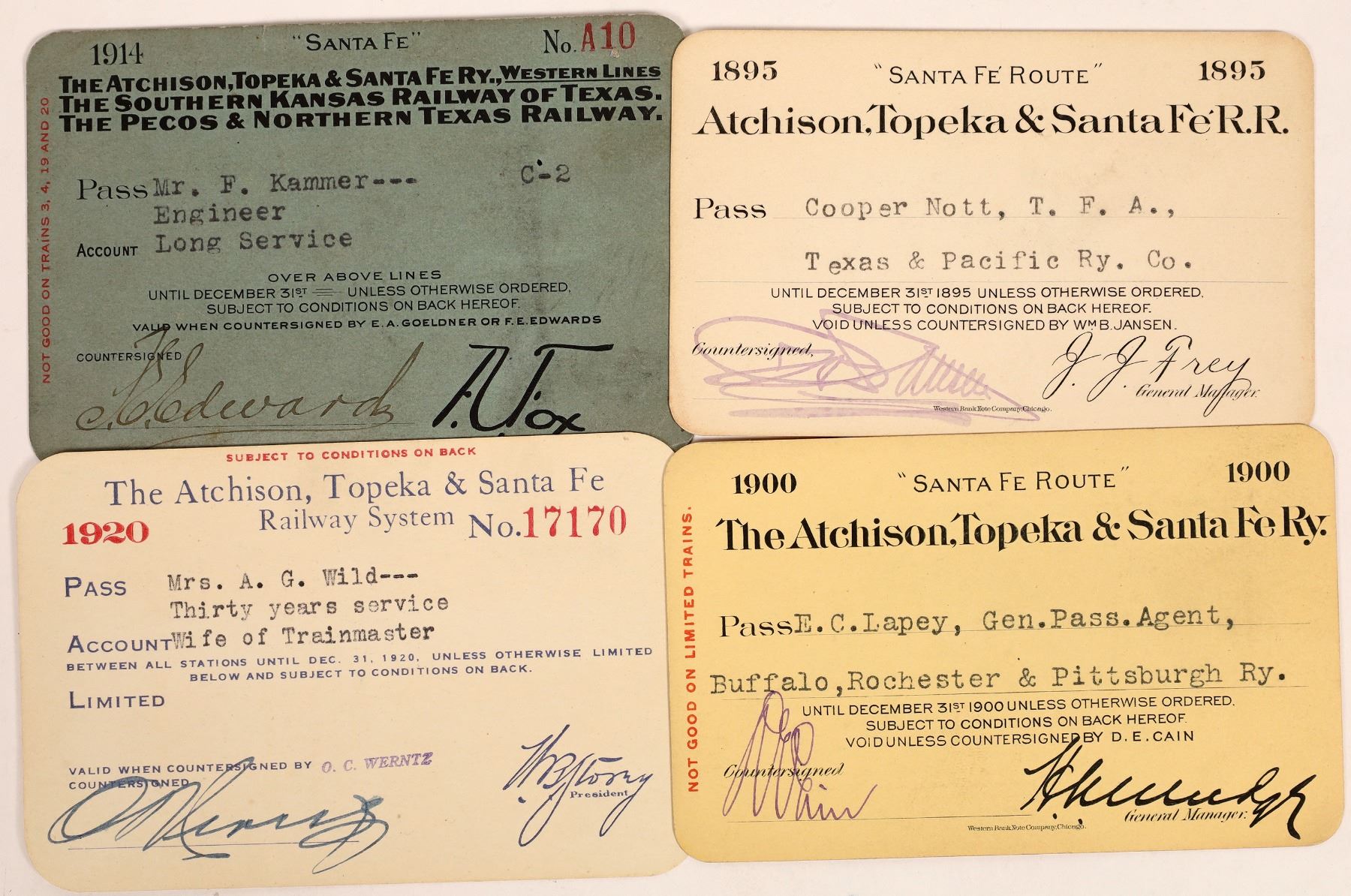 Lot of 4 different. "Santa Fe Route." Passes issued for 1895, 1900, 1914, and 1920. The 1914 pass also lists the Southern Kansas Railway of Texas and The Pecos & Northern Texas Railway.