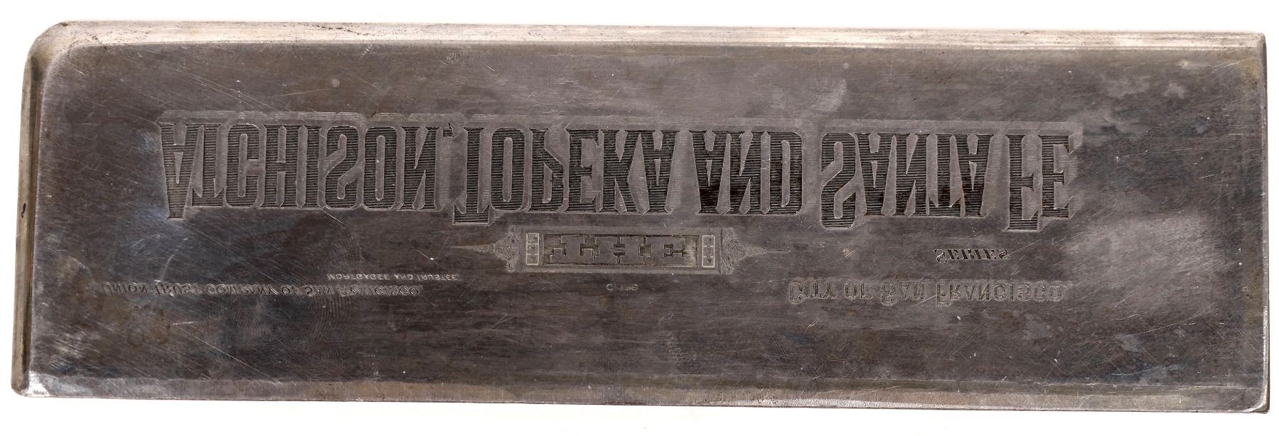 Steel printers plate for the masthead of bond for Atchison, Topeka & Santa Fe Railroad, City of San Francisco. Union Trust Company of San Francisco. No date or makers mark; possibly ABN. C1729 etched in small font above "The." Plate is 3 x 9.25" Many punch marks on the reverse; this was used!