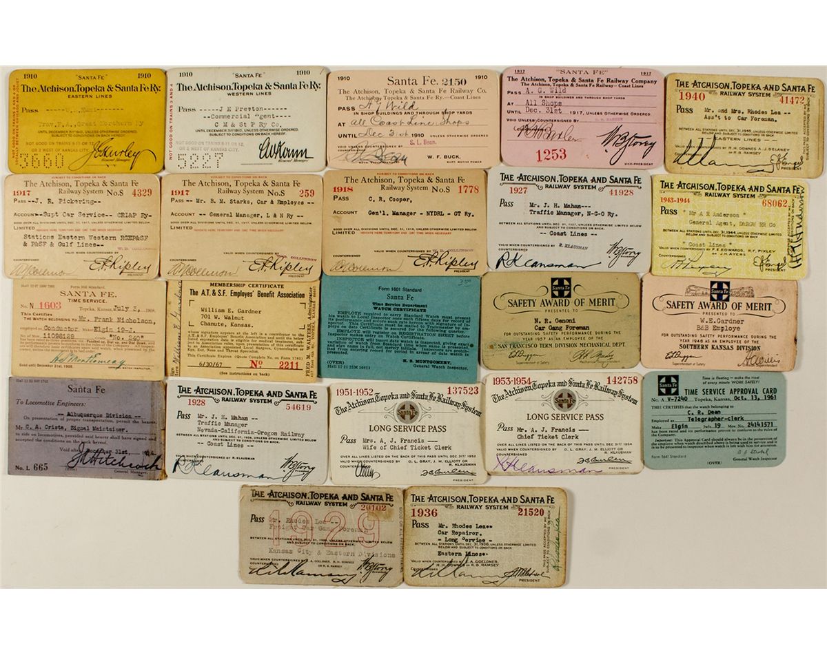 Lot of 22. Nine are special passes: Employee Benefits Assoc. card, watch certificate, Safety Award of Merit (2), Time Service Approval Card (2), Locomotive Engineers, and two Long Service passes. The remaining 13: 1910 (3), 1917 (3), 1918, 1927, 1928, 1929,1936, 1940, and 1943-44. Prag Collection