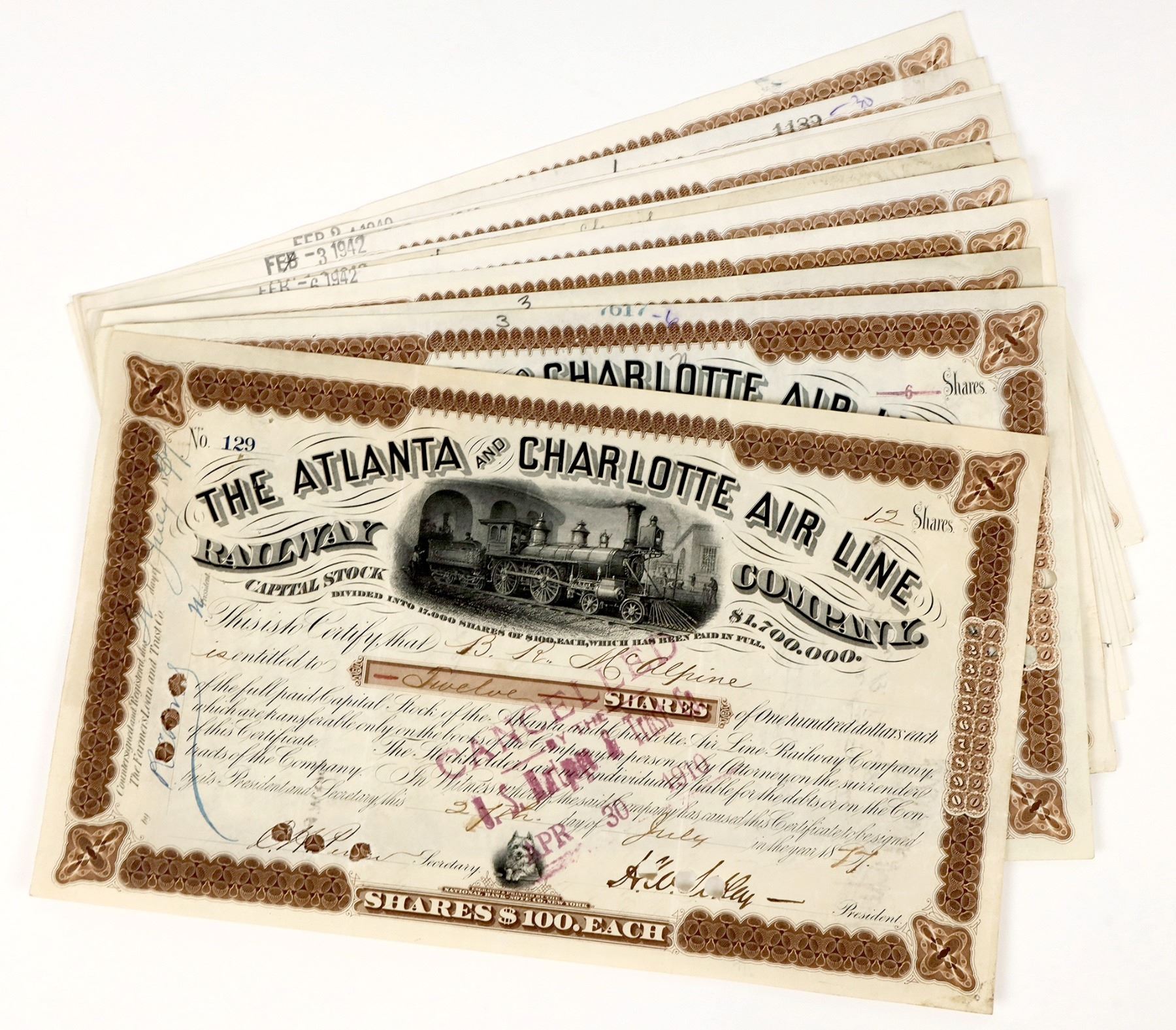 Group of 12 stock certificates from the Atlanta and Charlotte Air Line Railway Company, issued 1877 to 1942. All issued and cancelled with ink stamp or hole punch cancellations. Nice locomotive vignette. 11"x6.5" certs, varying in condition with some creasing/toning; see photos.