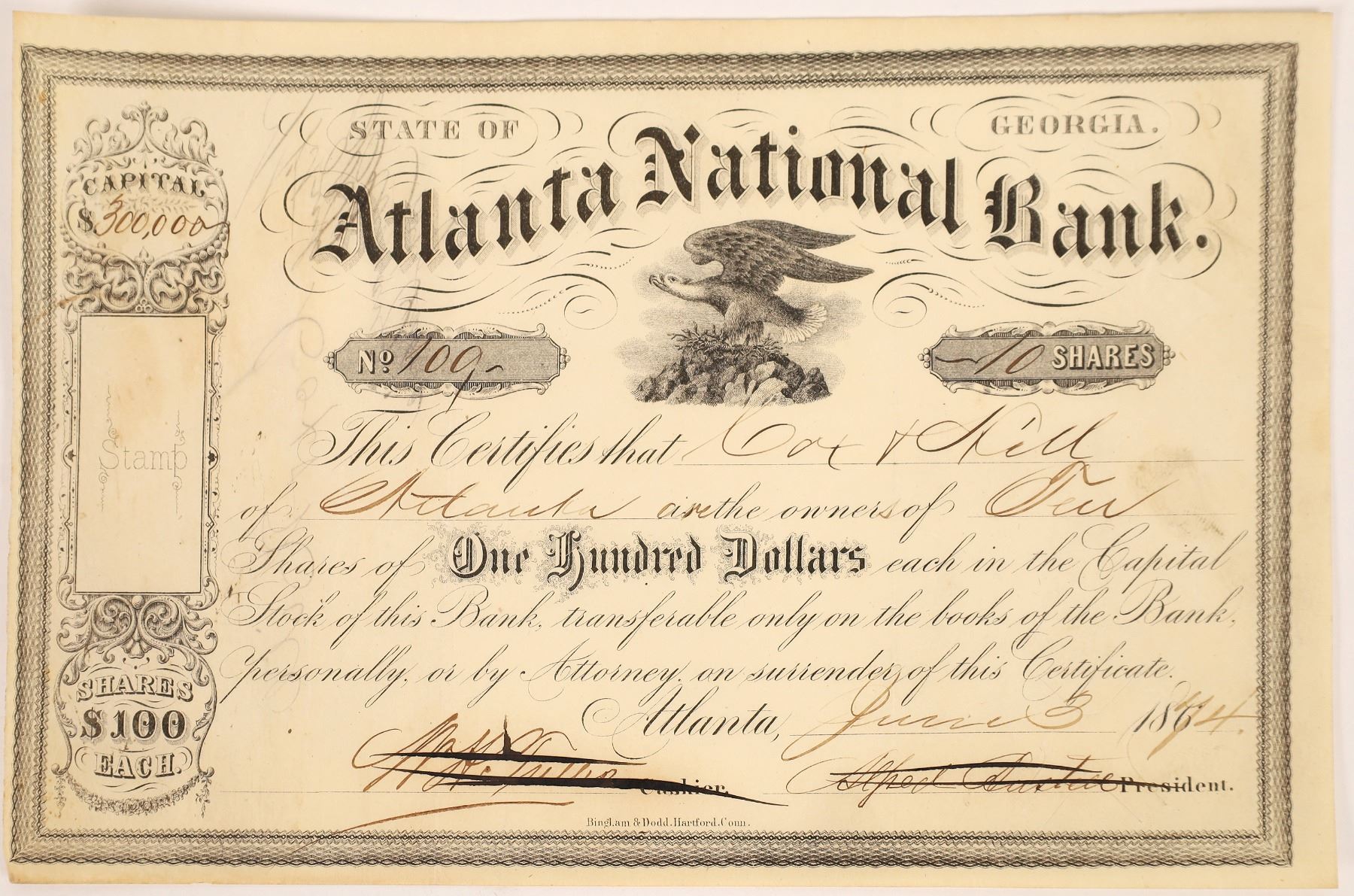 No. 100, issued for 10 shares to Cox & Hill on June 3rd, 1874 in Atlanta. Signed by president Alfred Austell and the cashier. Pen and cut cancelled signatures. Black border and print with eagle vignette. Printed by Bingham & Dodd, Hartford, Conn. 6.25 x 10" Folds, toning. This national bank opened in 1865 and stopped printing money in 1935. They issued 12 different types and denominations of national currency. Alfred Austell organized the bank and served as its president until his death in 1881. He was also a major player in the Georgia cotton industry, and helped build the Atlanta and Charlotte Air-Line and the Spartanburg-Asheville branch of what was later the Southern Railway. The town of Austell in Cobb County is named after him.