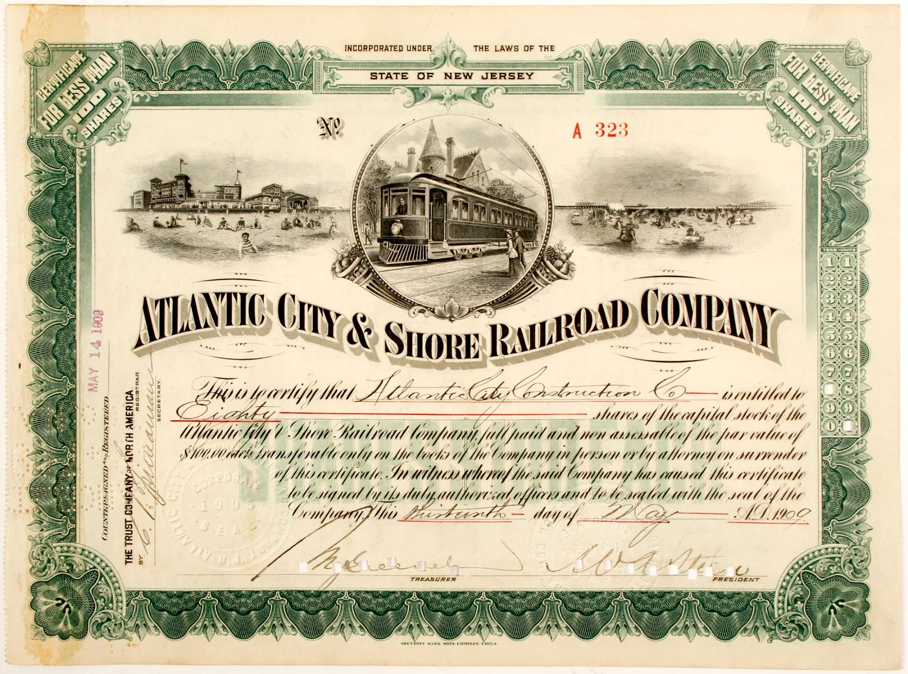 80 cancelled shares of Atlantic City & Shore Railroad Co. cert #A 323, dated May 13, 1909, countersigned and registered May 14, 1909. Issued to Atlantic City Construction Co. Inc. NJ. Three Vignettes: 2 of beach and 1 cable car. Raised company seal, green border. Atlantic City & Shore Railroad Co. ran from Atlantic City to Ocean City and Atlantic City to Longport, covering 24 miles. In 1906, the West Jersey and Seashore Railroad announced plans to electrify its main liner and formed the Atlantic City and Shore Railroad, called Shore Fast Line. Printed: Security Bank Note Co. Prag Collection.