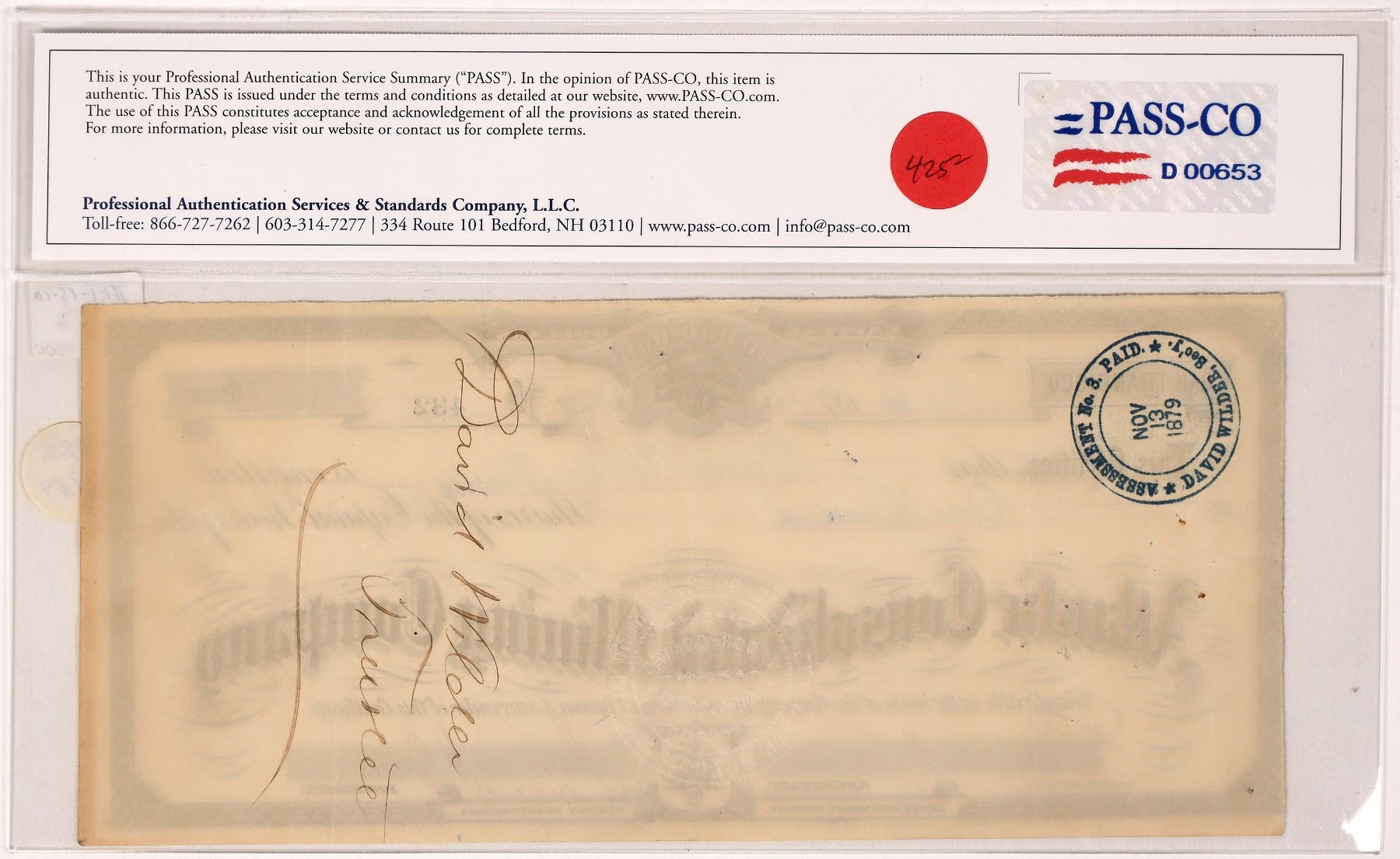 Atlantic Consolidated Mining Co. - Devils Gate Mining District, Storey County, NV - GT Brown Design - Cert. #432 issued to David Wilder, Trustee on Feb. 24, 1879, for 100 shares. Signed by David Wilder as Secretary and by James J. Green as vice-president. Incorporated in San Francisco on August 10, 1875, and capitalized at $10,000,000; 100,000 shares at $100 per. J. Robert Barr who was the San Francisco manager of the Anglo-California Land Company, was able to get some English investors to buy stock in a number of Nevada mines including the Atlantic Consolidated. Ref. (Spence, British Investors in American Mines, p. 36-7). The certificate has an artistic black border and decorative text. Printed by G. T. Brown in San Francisco, an early African American printer and artist. Uncancelled. Sealed Pass-Co security # STGC09326