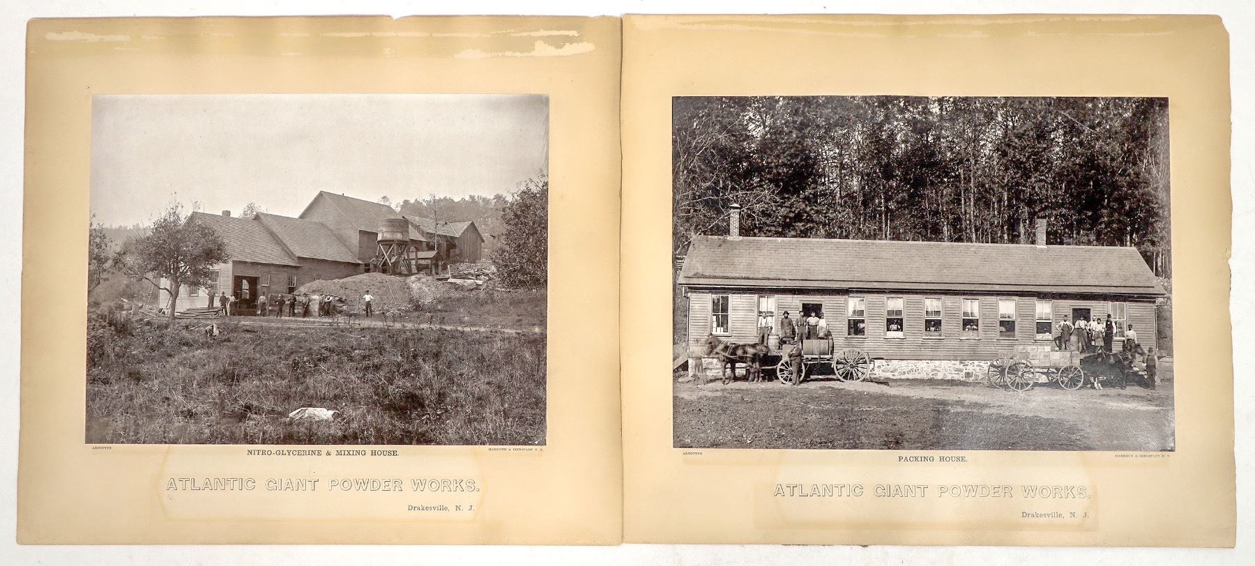 Two matted mammoth plate photos of the Atlantic Giant Powder Works operation at Drakesville, New Jersey. Photo by Harroun & Bierstadt, New York. "artotype" photo adhered to board. 14 x 16, image 9.25 x 13"