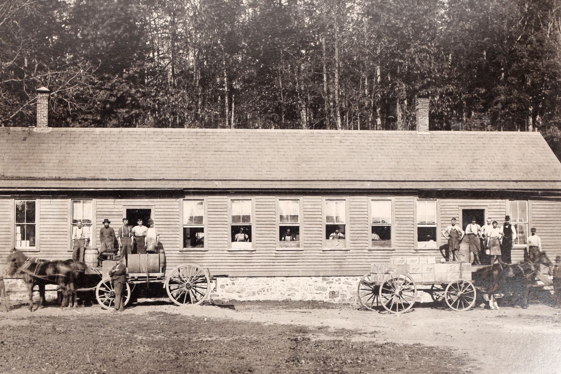 1) Packing House. Long building with two wagons out front and many workers posing. Notice the wooden marked boxes on the wagon! Do our mining collectors have any of these box ends?