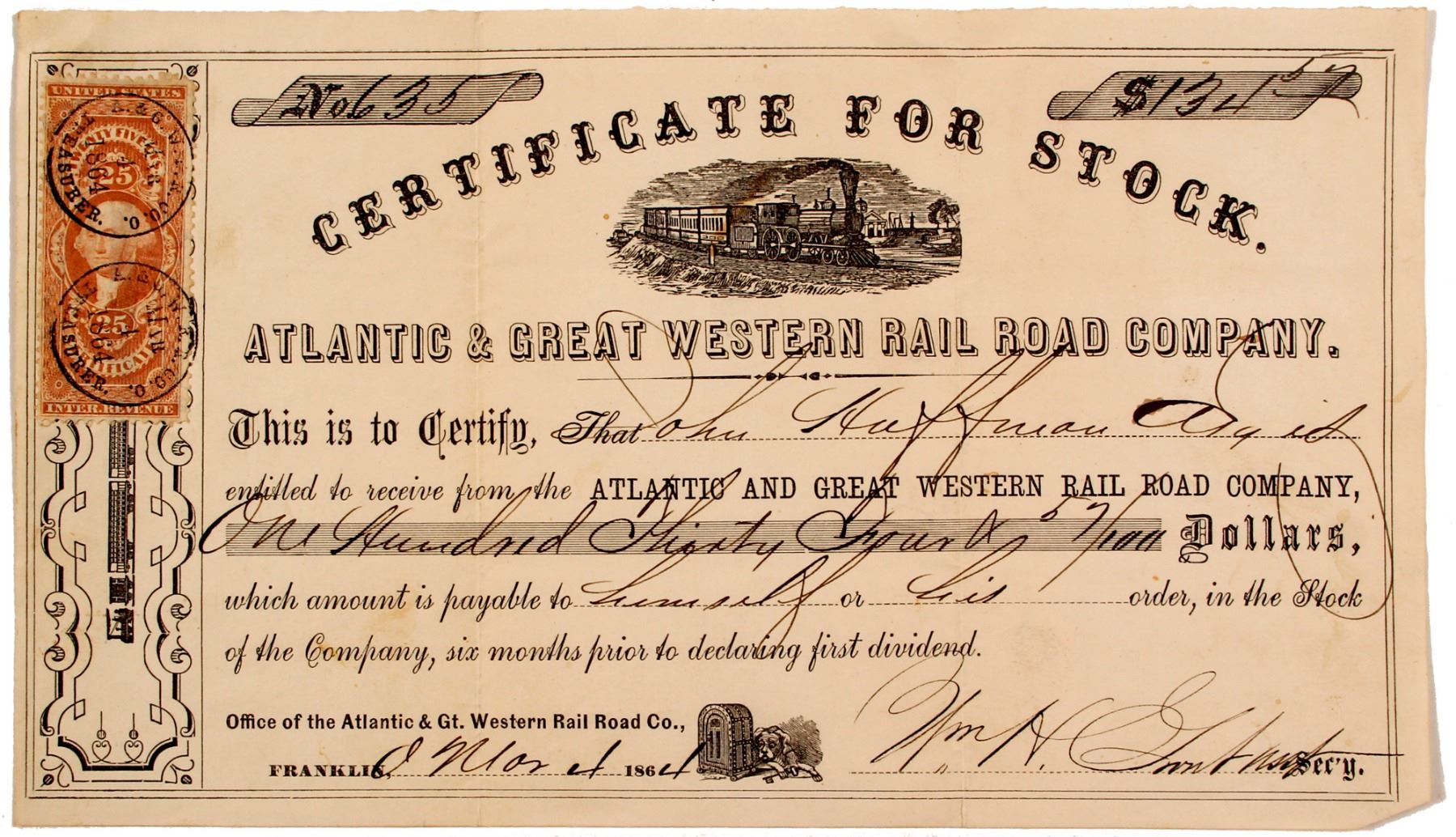 $134 for Atlantic & Great Western Rail Road Co cert #635 issued to John Huffman on Mar 4, 1864. 2 adhesive RN stamps. Vignette of train. Atlantic and Great Western Railroad began as 3 separate railroads: the Erie and New York City Railroad, Jamestown, NY; Meadville Railroad, Meadville, PA; Franklin and Warren Railroad, Franklin Mills, OH. New combined line reached Cleveland on Nov. 18, 1863, connected to the Cincinnati, Hamilton and Dayton Railroad in Dayton on June 20, 1864 linking St. Louis with New York. Aug. 19, 1865 3 companies combined into Atlantic and Great Western Railway. On Jan. 10, 1880 property sold at foreclosure and was reorganized as the New York, Pennsylvania and Ohio Railroad. Prag collection.