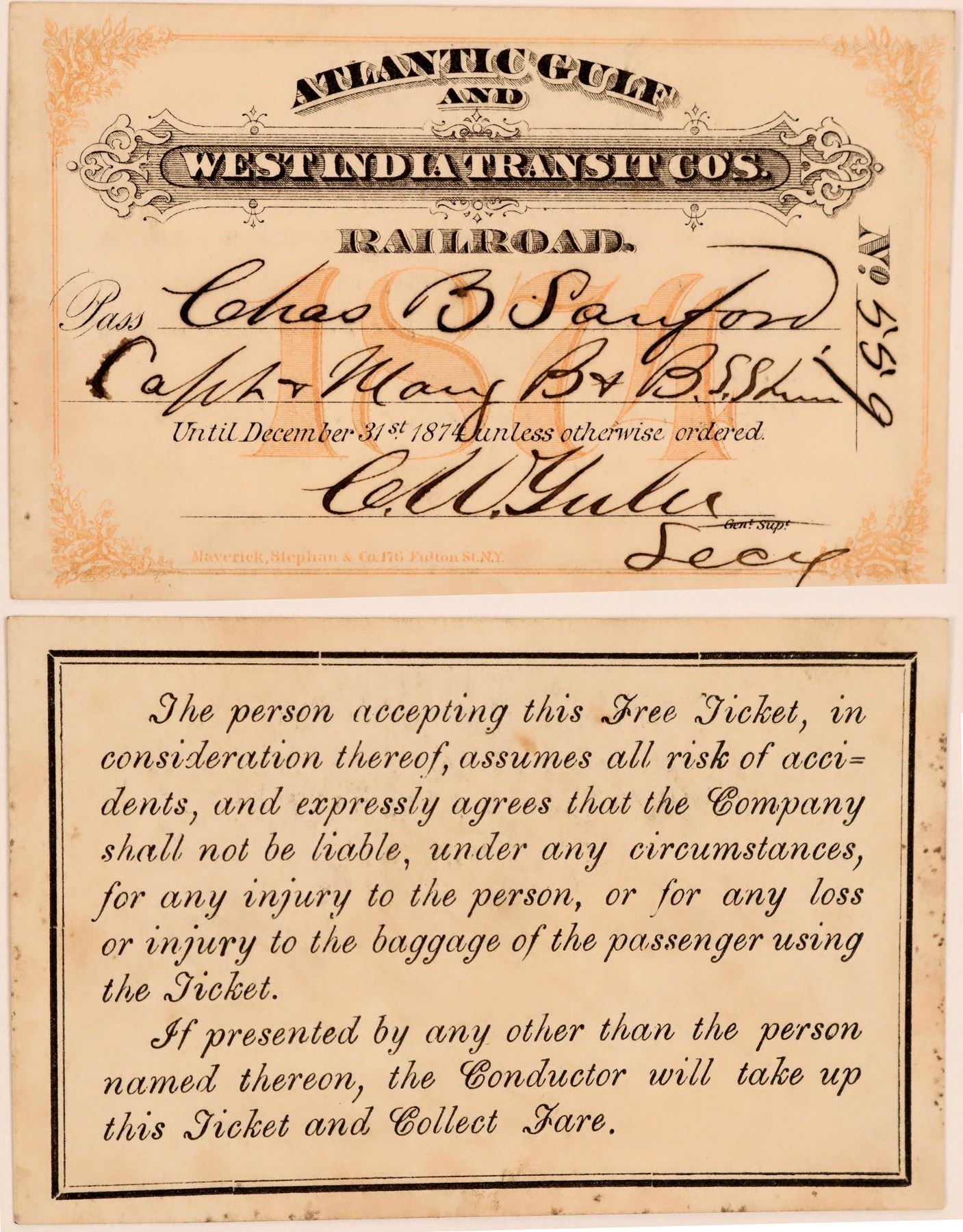 No. 559, issued for 1874 to Chas. B. Sarton(?). Signed by Secretary CW Yuler(?). Reverse has printed conditions. Orange border and underprint, black print. Printed by Maverick, Stephan & Co. NY. Minor wear. This railroad was originally the Florida Railroad, inc. in 1853. Their goal was to build a line from Fernandina, Florida southwest to Cedar Key, Florida. It was reorganized under this name in 1872.