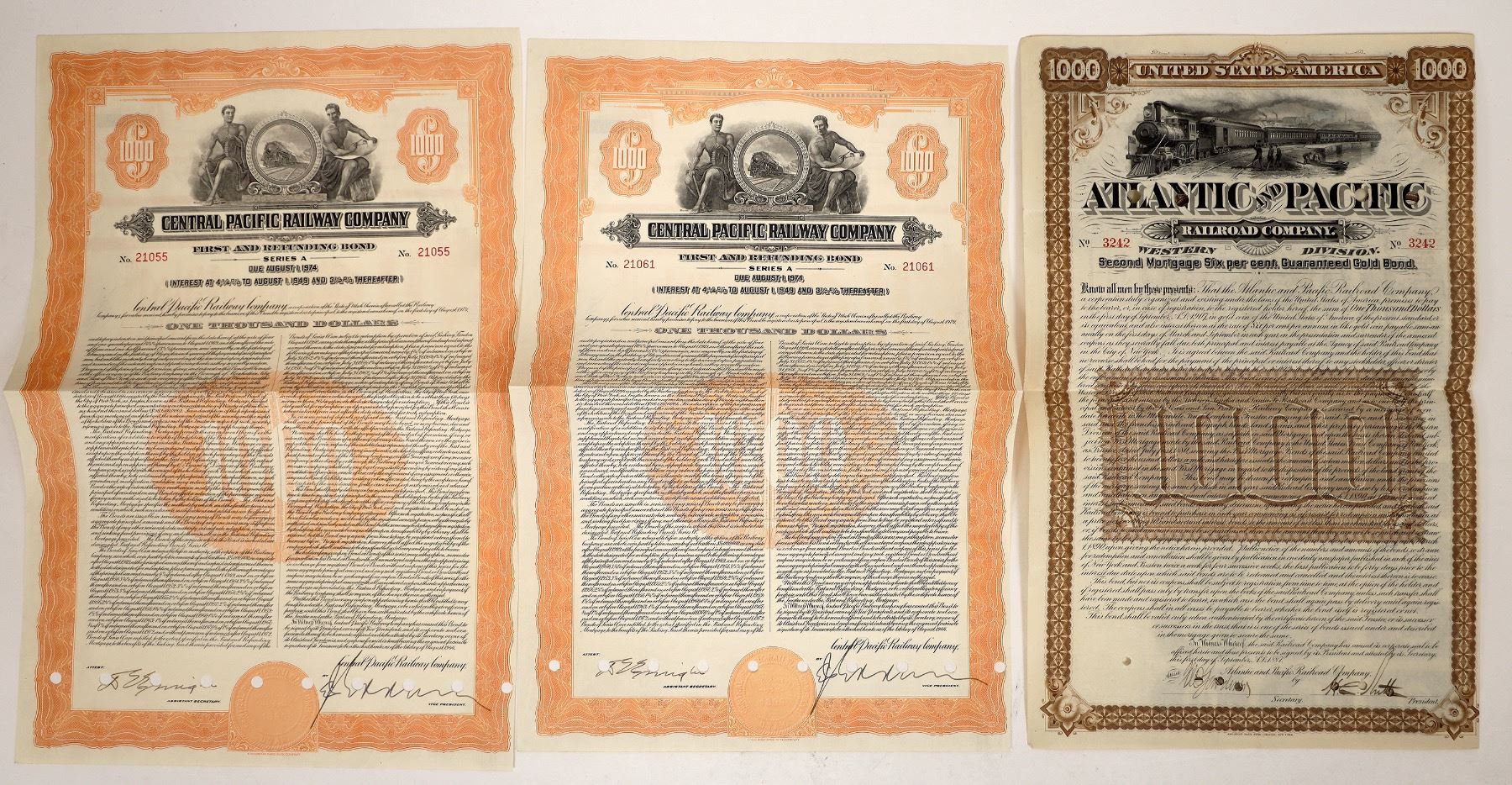 2 bond certificates from the Central Pacific Railway Company (dated 1944) and 1 bond certificate from the Atlantic & Pacific Railroad Company (dated 1877). All are issued and cancelled. Great vignettes of locomotives. All in great condition. A&P Railroad bond has 33 attached coupons.