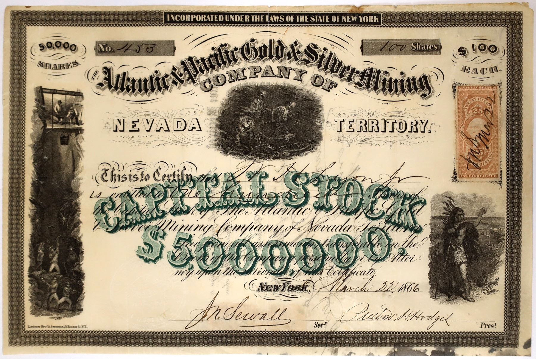 # 453 for 100 shares to NH Lyon Jr. signed by J Sewell and Preston Hodges. Dateline New York 1866. 25c Power of Att'y revenue stamp. Not cancelled. Two mining vignettes and one Native American vignette. Printer Latimer Bros. & Seymour. Tears and discoloration along borders. This has the look of a post-territorial stock. However, an ad in the Daily Alta California on June 19, 1864 proves it is territorial. The company owned the Silver Wave Mining and Land Company seven miles south of Ione. A VERY RARE Nye County Territorial certificate. The trustees are mentioned and include Preston H. Hodges and list the secretary as J. N. Sewell. That makes this a rare New York backed Nevada Territory mining venture. (Notes from Alta California included.)