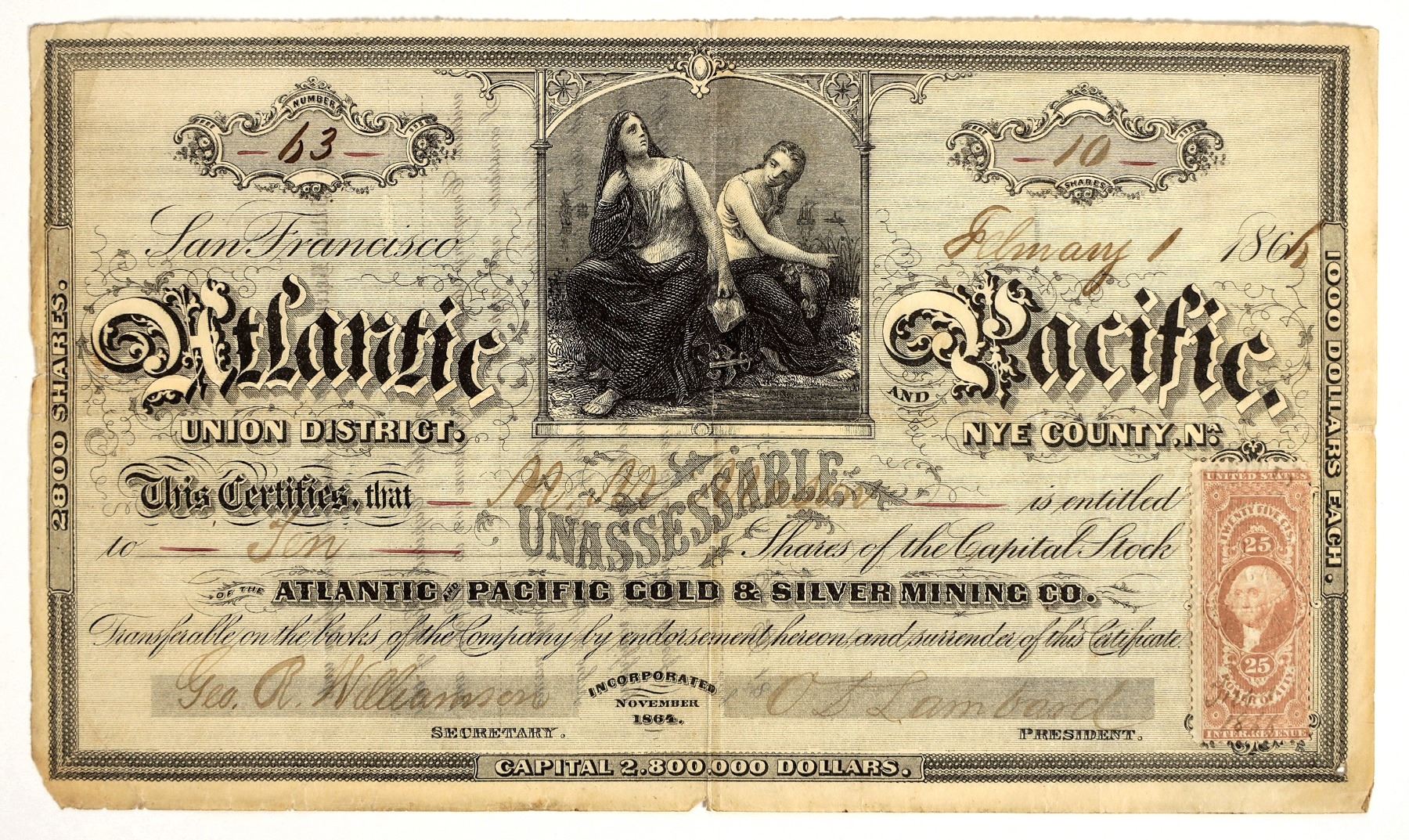 Second one FH has ever seen. "Union District, Nye County, Na." printed on either side of vignette of two allegorical figures. Inc. 1864. No. 63, issued for 10 shares issued to NM Mason in San Francisco in 1866. Signed by president OL Lambard and secretary Geo. R. Williamson. Not cancelled. Fancy title and gray underprint. 25 cent revenue stamp. Folds, toning, a few small tears. 5.5 x 9.25" The tiny town of Union was located in Union Canyon, south of the county seat of Nye County at Ione. Mining began in 1863 and the Atlantic & Pacific Company quickly owned all the mines in the district. They platted the townsite of Union and started building a stamp mill but soon faded away. The name of the company was designed to attract attention. It coincides with the A & P telegraph, the A&P railroad, the A&P steamship company and others. We have sold territorial pieces from this company in the past.