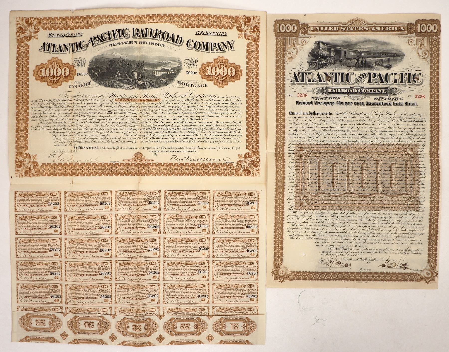 2 bond certificates from the Atlantic & Pacific Railroad Company, dated 1880 and 1887. Both are issued, one is cancelled. Both certificates have nice vignettes of railways/locomotives. The certificates each include pages of bond coupons (one with 33 coupons, one fully intact with 40). Both are in good condition.