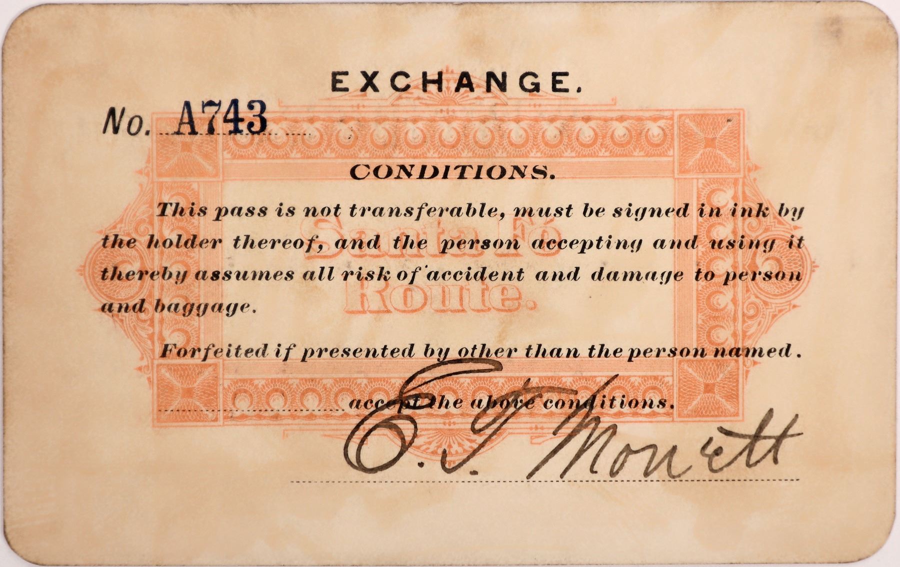 Santa Fe Route 1896 Atlantic & Pacific Railroad pass No. A 743 issued to Mr. E. T. Monett agent, New York, Ontario & Western Railway. Ivory card stock. State: City: Date:1896 Provenance: