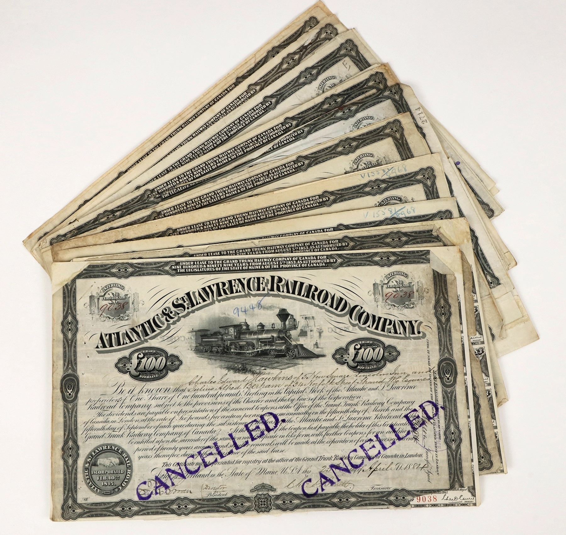 Group of 11 bond certificates from the Atlantic & St. Lawrence Railroad Company, issued 1882 to 1924. Each certificate has an attached page of bond coupons. All issued, all cancelled with an ink stamp cancellation. Nice vignette of locomotive. Certificates vary in condition, with some toning/wear/light soiling; see photos.